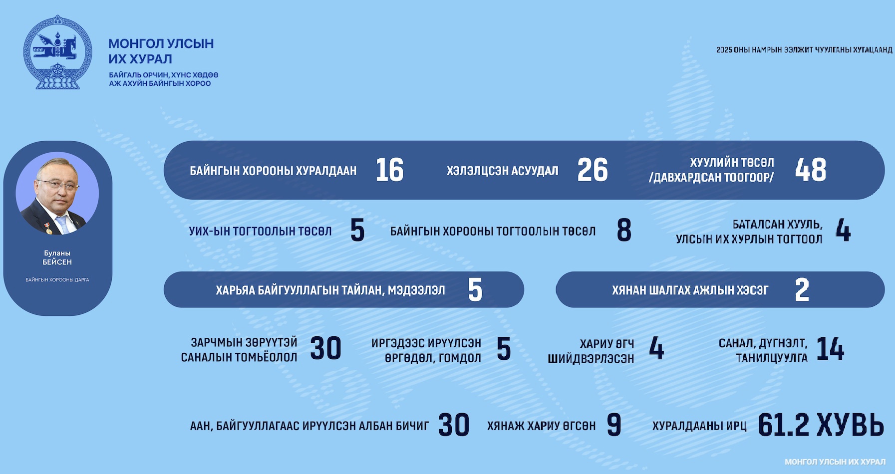 The Standing Committee also jointly discussed, together with the Standing Committee on Budget, the draft resolution of the State Great Hural titled “On Amending a Resolution,” submitted by the Government on November 19, 2025. A consolidated opinion and conclusion were prepared, and the resolution was discussed and approved at the plenary session on December 11, 2025.