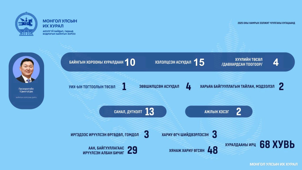 The ratification of the General Financing Program by the State Great Hural will enable improvements to the healthcare system, including expanding and modernizing nationwide emergency and intensive care infrastructure, and providing well‑equipped ambulances and mobile clinics. The program will also allow the construction of 41 new schools and kindergartens that meet required standards without increasing pressure on the state budget. Additionally, it will support the development of skilled human resources in the agricultural sector, enhance the capacity of emergency response and disaster recovery services to international standards, improve the availability of modern firefighting equipment, vehicles, and protective gear, and strengthen public disaster preparedness in cooperation with the public and private sectors.