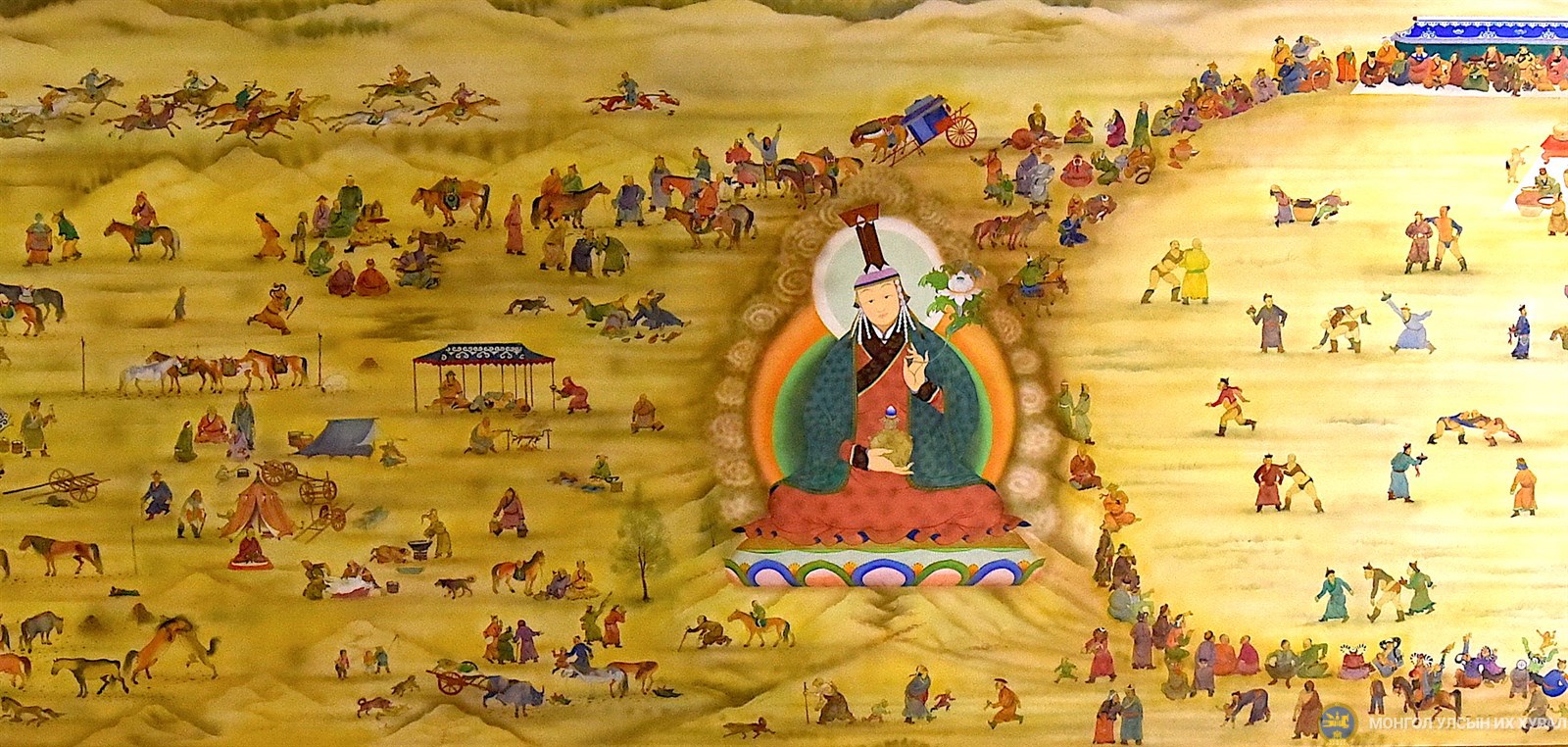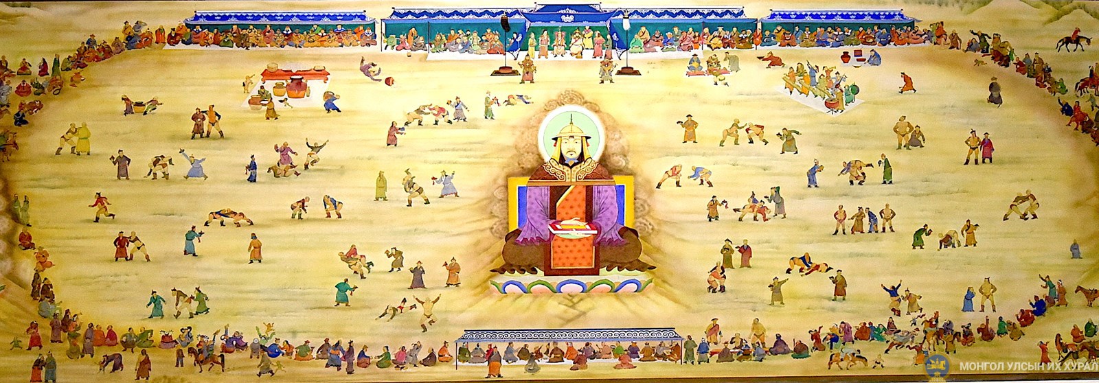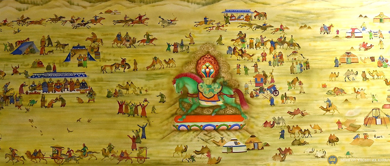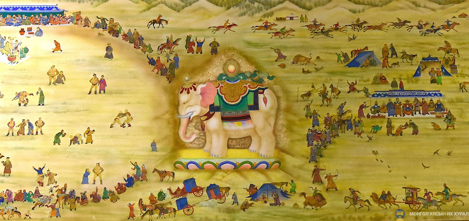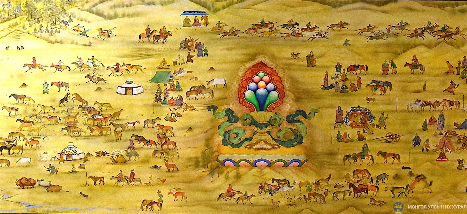 Уг бүтээлд нүүдэлчин ахуйтай монголчуудын нэгэн өдрийн 108 үйл явдлыг Хан төрийн долоон эрдэнээр тойруулан харуулсан байдаг. Бүтээлд 999 хүнийг дүрслэн харуулснаас 64 нь бөх, мөн 551 мал, 13 гэр, есөн нохойг багтаасан байна. Зураач 999 хүний дүрийг бүтээхдээ 1996-2000 оны хооронд ажиллаж байсан УИХ, Засгийн газрын гишүүд, олны танил бизнесмэнүүд, бөх, урлагийнхан зэрэг бодит хүмүүсийн дүрийг уран сайхны аргаар оруулсан гэдэг. Тухайлбал, Гандантэгчинлэн хийдийн тэргүүн хамба Д.Чойжамц эрх эргүүлэн маани тоолж суухад улсын начин Б.Оргилболд даншигт зодоглон засуулаа түшээд зогсч байна. Х.Баянмөнх аварга наадамд түрүүлэн дэвж, Монгол Улсын Ерөнхийлөгч асан Н.Багабанди мөн л нэг санваартны дүрээр олбогт заларсан харагдана.