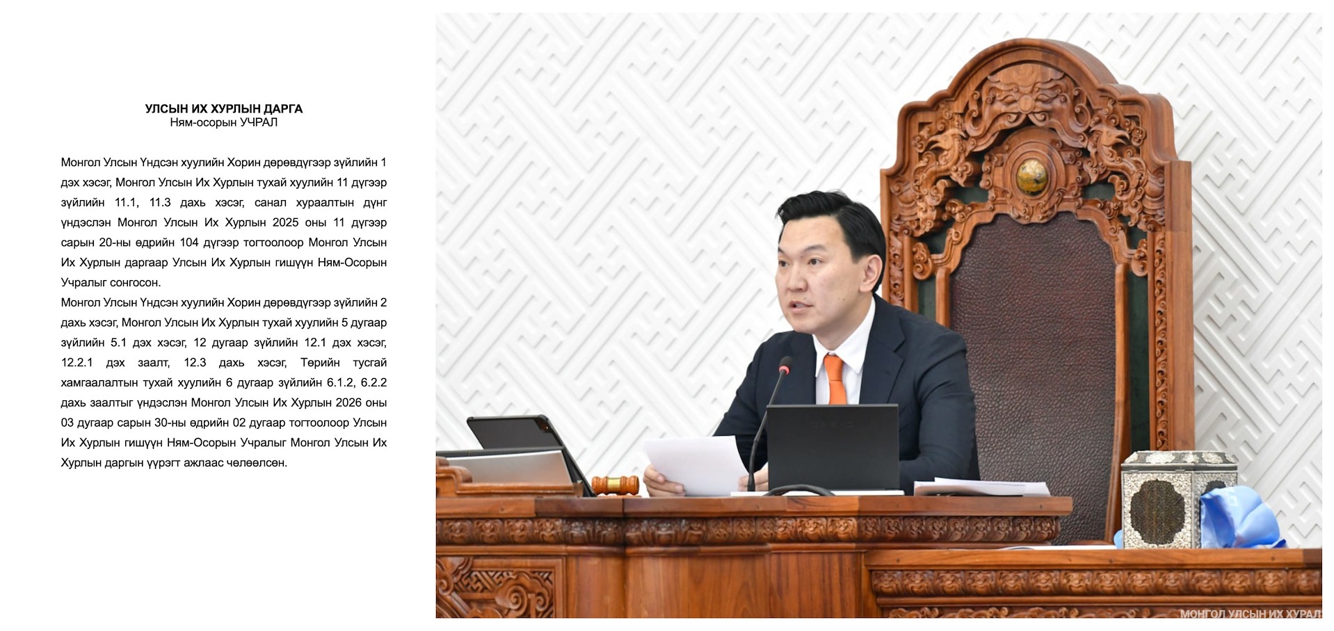 Монгол Улсын Их Хурлын 2026 оны 04 дүгээр сарын 03-ны өдрийн чуулганы нэгдсэн хуралдаанаар Улсын Их Хурлын гишүүн Сандагийн Бямбацогтыг Монгол Улсын Их Хурлын даргаар сонгов.