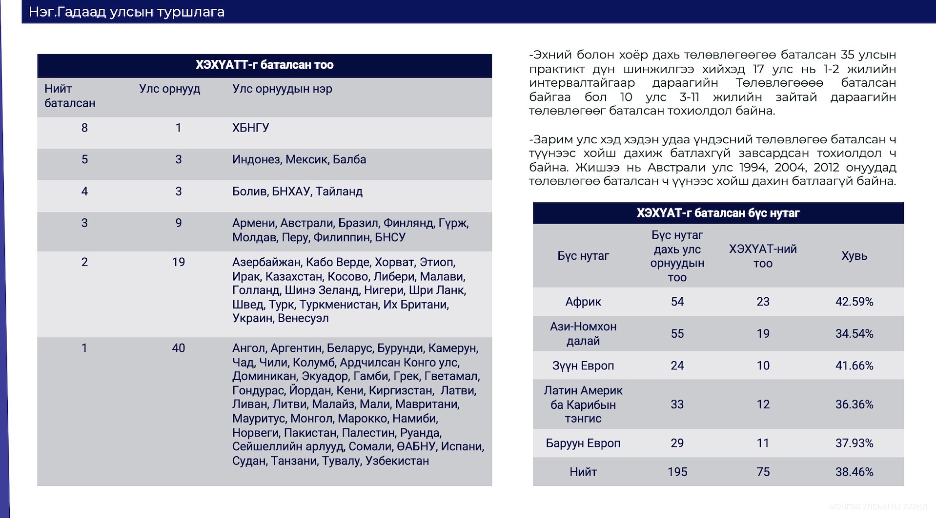 Хамгийн анхны хүний эрхийн үндэсний хөтөлбөрийг Австрали улс баталсан, өдгөө 140 гаруй улс орон ийм хөтөлбөрийг батлан хэрэгжүүлж байгаа аж. Үүний 35 нь хоёроос дээш удаа буюу 4, 5, 8 удаа, 75 нь нэг удаа баталсан байдаг юм байна. Улс орнууд энэ чиглэд 2010 оноос хойш онцгой анхаарч, үндэсний хөтөлбөр, төлөвлөгөөгөө баталж ирсэн талаарх баримтыг дурдсан. Улс орнуудын хөтөлбөрөө баталсан хугацаа харилцан адилгүй байсныг Х.Баасанжаргал гишүүн тодотгоод “Улс орнууд эхний хөтөлбөрөө батлахдаа тухайн улсын хүний эрхийн нөхцөл байдлыг нийтлэг байдлаар сайжруулахад анхаарч байсан бол дараа, дараагийн хөтөлбөрөө сэдэвчилсэн, тодорхой чиглэлээр дагнах байдлаар боловсруулж, баталдаг байна. Тодруулбал, хүний эрхийг хангах, хамгаалах нийтлэг асуудлуудаа шийдсэн, ахиц дэвшил гаргасан гэж үзэж байгаа улс тодорхой сэдвээр нарийвчлах, дагнах байдлаар хөтөлбөрөө боловсруулж, баталж байгаа юм билээ” гэв.