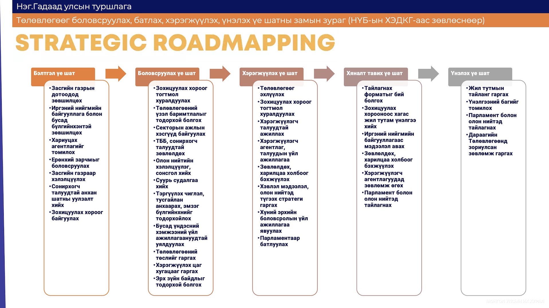 Хүний эрхийн үндэсний хөтөлбөрийг боловсруулах замын зураглалыг НҮБ-аас гаргасан байдаг бөгөөд үр дүнтэй, хэрэгжихүйц хөтөлбөр боловсруулахын тулд Улсын Их Хурлын ажлын хэсэг энэ дагуу төлөвлөн, ажиллаж байгаа гэв.