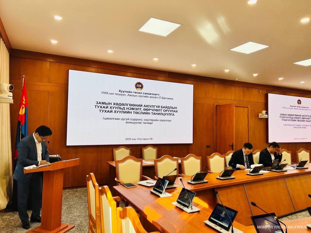 Энэхүү хуулийн төслийг Улсын Их Хурлын 2025 оны намрын ээлжит чуулганы хугацаанд Байнгын хороо болон чуулганы нэгдсэн хуралдаанаар хэлэлцүүлэх, бэлтгэл ажлыг хангах, санал, дүгнэлтийн төсөл боловсруулах үүрэг бүхий Ажлын хэсгийг Улсын Их Хурлын гишүүн Г.Уянгахишиг ахалж, Улсын Их Хурлын гишүүн О.Алтангэрэл, Б.Баярбаатар, Х.Баасанжаргал, О.Номинчимэг, Д.Пүрэвдаваа, Л.Соронзонболд нарын бүрэлдэхүүнтэй байгуулсан. Уг Ажлын хэсэг өнөөдөр (2025.10.08) анхны хуралдаанаа хийлээ. Ажлын хэсгийн хуралдаанаар хуулийн төслийг тал бүрээс нь хэлэлцэх зорилгоор холбогдох төрийн байгууллага, нийтийн хэрэгцээний цахилгаан дугуй, скүүтер түрээсийн үйлчилгээ эрхлэгчид, мэргэжлийн хүмүүс, иргэдийн төлөөлөл зэрэг олон талын төлөөллөөс бүрдсэн Дэд ажлын хэсэг байгуулж ажиллуулахаар шийдвэрлэлээ.