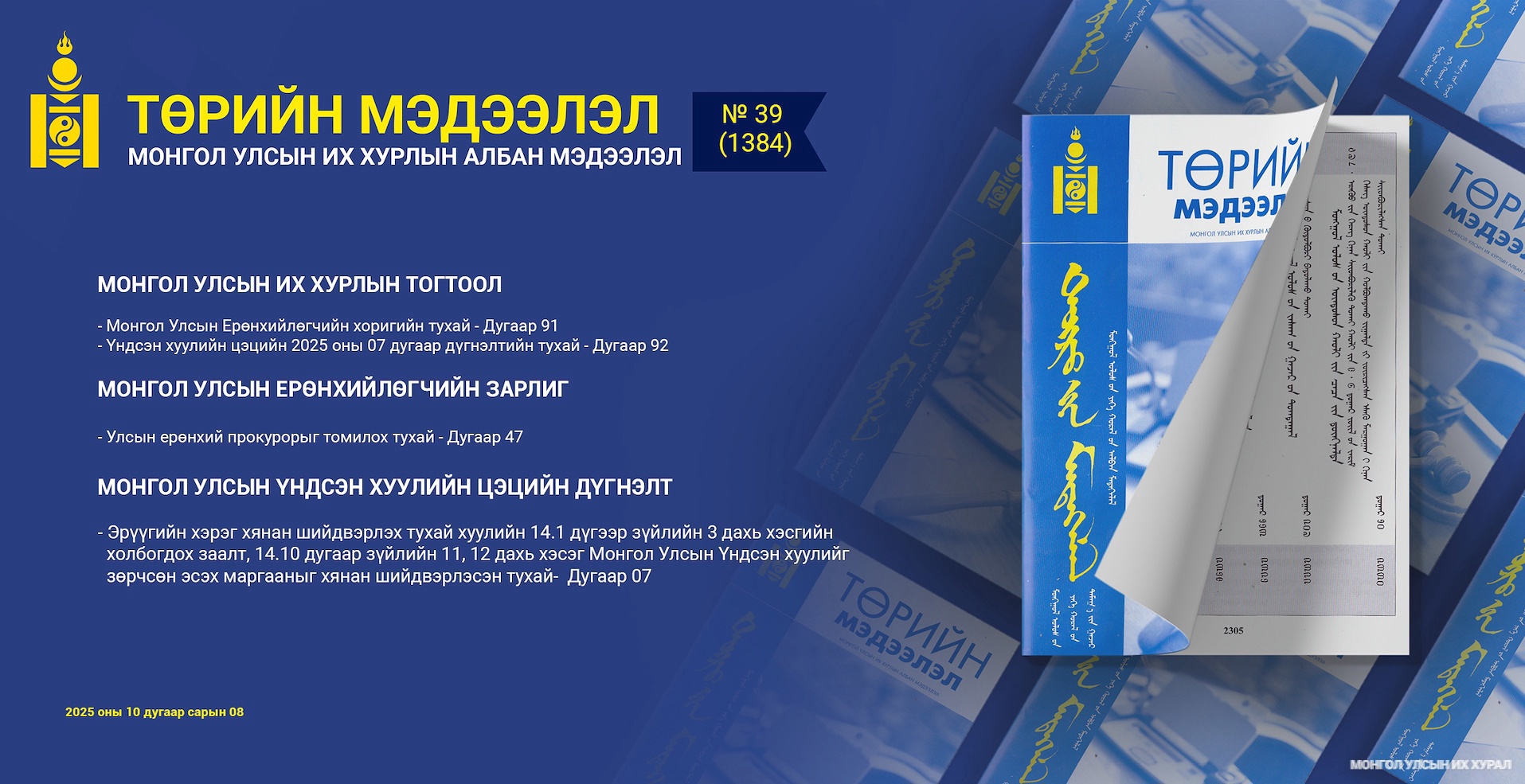 2025.10.09. “Төрийн мэдээлэл” эмхэтгэлийн 2025 оны 39 дугаарын тойм хэвлэгдлээ. Шинэ дугаарт “Монгол Улсын Ерөнхийлөгчийн хоригийн тухай”, “Үндсэн хуулийн цэцийн 2025 оны 07 дугаар дүгнэлтийн тухай” Монгол Улсын Их Хурлын тогтоолууд болон “Эрүүгийн хэрэг хянан шийдвэрлэх тухай зарим заалт Монгол Улсын Үндсэн хуулийг зөрчсөн эсэх маргааныг хянан шийдвэрлэсэн тухай” Монгол Улсын Үндсэн хуулийн цэцийн дүгнэлтийг нийтэлсэнтэй дэлгэрэнгүй танилцах боломжтой... https://www.parliament.mn/nn/75836/
