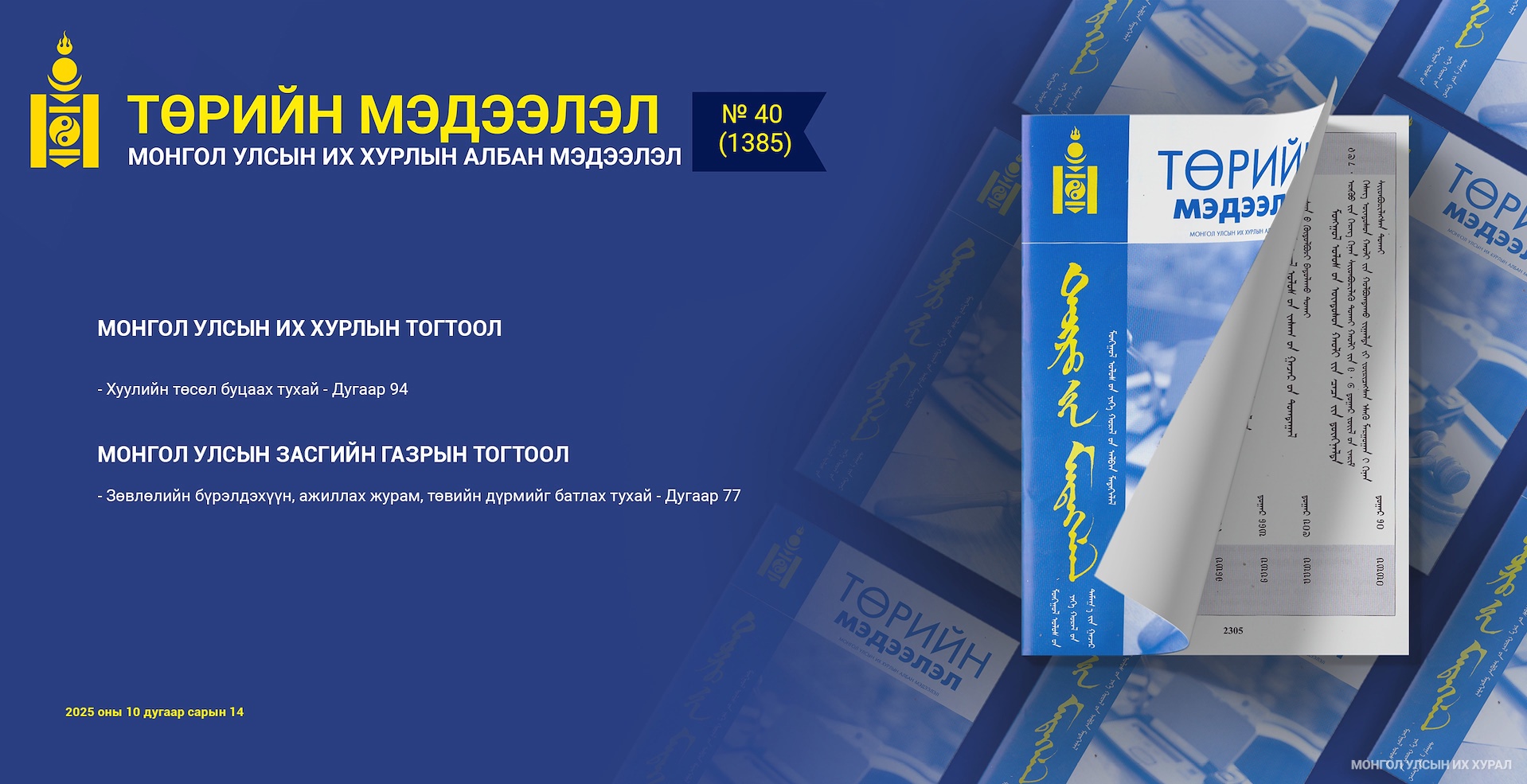 “Төрийн мэдээлэл” эмхэтгэлийн шинэ дугаарт “Хуулийн төсөл буцаах тухай” Монгол Улсын Их Хурлын тогтоолыг нийтэлсэн бөгөөд тус тогтоолоор Монгол Улсын Их Хурлын гишүүн М.Мандхай, Б.Бейсен, Л.Соронзонболд, Г.Хосбаяр, Р.Батболд, Д.Үүрийнтуяа, У.Отгонбаяр, Ц.Идэрбат, Л.Энхнасан, М.Ганхүлэг нараас 2025 оны 6 дугаар сарын 19-ний өдөр Монгол Улсын Их Хуралд Хөдөө аж ахуйн тухай хуулийн төсөлтэй хамт өргөн мэдүүлсэн Газрын тухай хуульд нэмэлт, өөрчлөлт оруулах тухай, Малчны тухай хуульд нэмэлт, өөрчлөлт оруулах тухай, Тариалангийн тухай хуульд нэмэлт, өөрчлөлт оруулах тухай, Монгол Улсын засаг захиргаа, нутаг дэвсгэрийн нэгж, түүний удирдлагын тухай хуульд нэмэлт, өөрчлөлт оруулах тухай хуулийн төслийг үзэл баримтлалын хүрээнд хэлэлцэхийг нэгдсэн хуралдааны санал хураалтад оролцсон гишүүдийн олонх дэмжээгүй тул хууль санаачлагчид нь буцаажээ.