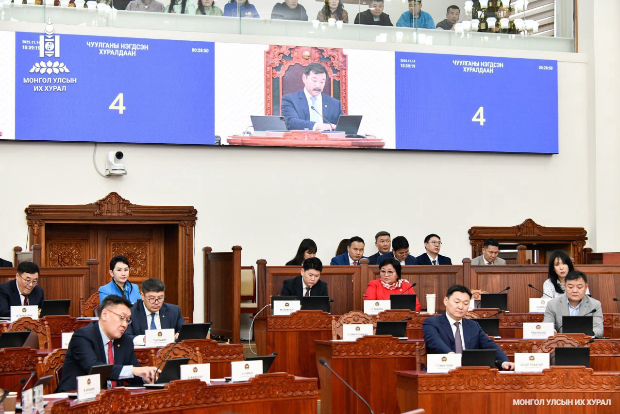 2025.11.12. Чуулганы нэгдсэн хуралдаанаар Монгол Улсын нэгдсэн төсвийн 2026 оны төсвийн хүрээний мэдэгдэл, 2027-2028 оны төсвийн төсөөллийн тухай хуульд өөрчлөлт оруулах тухай хуулийн төслийн гурав дахь хэлэлцүүлгийг хийж, дөрөв дэх хэлэлцүүлэгт шилжүүллээ... https://www.parliament.mn/nn/76087/