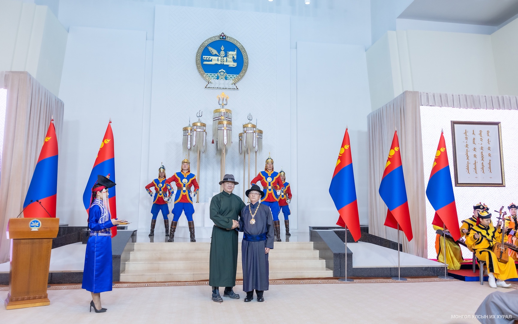 Их Эзэн Чингис хааны мэндэлсэн “Монгол бахархлын өдөр”-өөр төрийн дээд шагнал “Чингис хаан” тэргүүн зэргийн одон гардуулдаг уламжлалт ёслолд Улсын Их Хурлын дарга Ням-Осорын Учрал, Ерөнхий сайд Гомбожавын Занданшатар болон төр, нийгмийн нэр зүтгэлтнүүд оролцлоо. Ардчилсан Үндсэн хуулийг хэрэгжүүлэх эх үндэс болсон хууль тогтоомжийг шинэчлэн батлах, хууль зүйн боловсролтой мэргэжилтэн бэлтгэх, үндэсний эрх зүйн тогтолцоо, хууль зүйн шинжлэх ухааныг хөгжүүлэхэд оруулсан үнэтэй хувь нэмэр хийгээд Эзэн Чингис хааны дэлхий дахинд шударга ёс, энхийг тогтоосон их үйл хэрэг, гарамгай гавьяаг сурвалжлан судлахад олон жилийн хөдөлмөр зүтгэлээ зориулж, эх оронч үндэсний үзлийг төлөвшүүлэх олон арван бүтээл туурвин, шинжлэх ухааны болон сургалт, судалгааны эргэлтэд оруулсныг өндрөөр үнэлж академич Содовсүрэнгийн Нарангэрэлд “Чингис хаан” тэргүүн зэргийн одон гардуулсан юм.