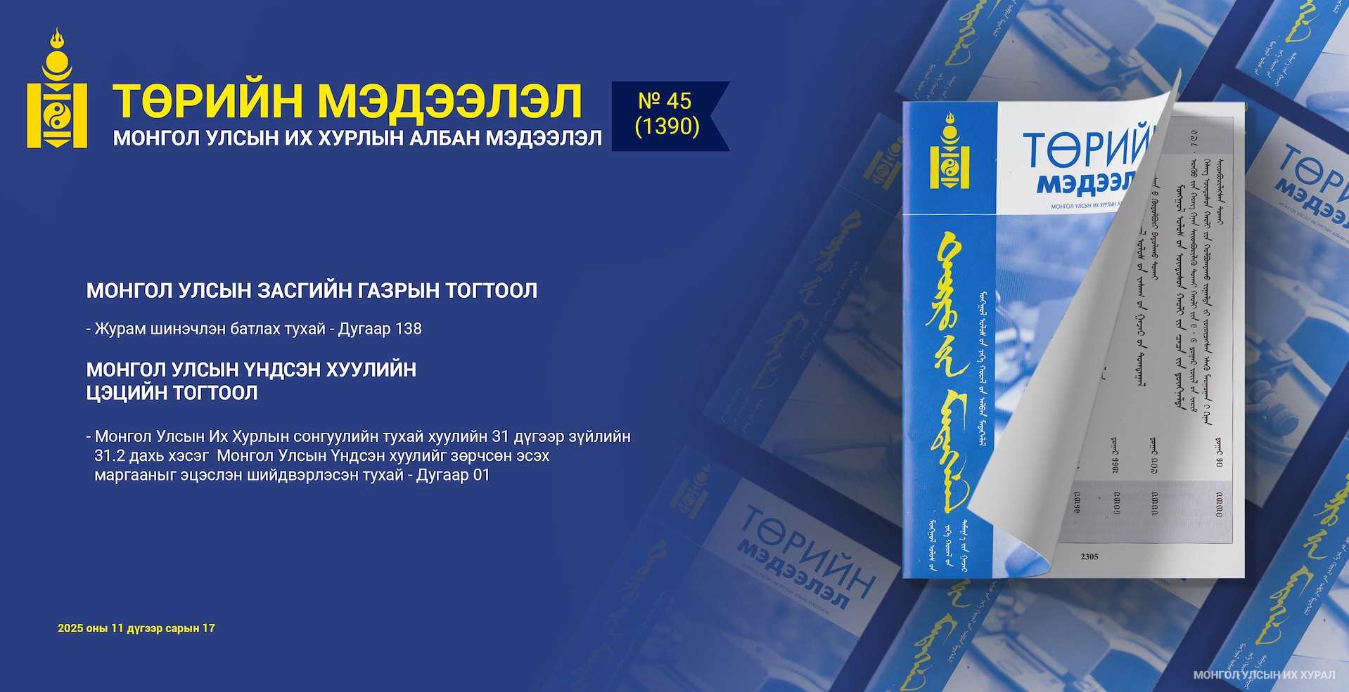 “Төрийн мэдээлэл” эмхэтгэлийн шинэ дугаарт “Журам шинэчлэн батлах тухай” Монгол Улсын Засгийн газрын тогтоол болон “Монгол Улсын Их Хурлын сонгуулийн тухай хуулийн 31 дүгээр зүйлийн 31.2 дахь хэсэг Монгол Улсын Үндсэн хуулийг зөрчсөн эсэх маргааныг эцэслэн шийдвэрлэсэн тухай” Монгол Улсын Үндсэн хуулийн цэцийн тогтоолыг нийтэлсэнтэй дэлгэрэнгүй танилцах боломжтой байна. Тухайлбал, “Журам шинэчлэн батлах тухай” Засгийн газрын тогтоолын хавсралтаар “Газрыг улсын тусгай хэрэгцээнд авах, гаргах, түүний хэмжээ, заагийг тогтоох, ашиглах журам”-ыг баталсан бөгөөд тус журмын зорилго нь газрыг улсын тусгай хэрэгцээнд авах, улсын тусгай хэрэгцээнээс гаргах болон улсын тусгай хэрэгцээний газрыг ашиглахтай холбогдон үүсэх харилцааг зохицуулахад оршино. Улмаар аймаг, нийслэлийн Засаг дарга, төрийн захиргааны төв болон Засгийн газрын гишүүний эрхлэх асуудлын хүрээнд хамаарах байгууллага нь газрыг улсын тусгай хэрэгцээнд авах хүсэлтийг газрын асуудал эрхэлсэн төрийн захиргааны байгууллагад гаргах юм байна. Газрын асуудал эрхэлсэн төрийн захиргааны байгууллага нь улсын тусгай хэрэгцээнд авсан газрын зориулалтаас хамаарч холбогдох төрийн захиргааны төв байгууллага, эсхүл Засгийн газрын гишүүний эрхлэх асуудлын хүрээнд хамаарах бусад байгууллага, эсхүл төрийн эзэмшлийн хувьцаа эзэмшигчийн эрхийг хэрэгжүүлэгчтэй “Улсын тусгай хэрэгцээний газрын ашиглалтыг хариуцах гэрээ”-г байгуулна. Тус журамд заасан гэрээгээр хүлээсэн үүргээ биелүүлээгүй, улсын тусгай хэрэгцээний газрыг ашиглах горим, дэглэмийг зөрчсөн тохиолдолд газрын асуудал эрхэлсэн төрийн захиргааны байгууллага нь холбогдох гэрээг цуцлах, газрыг улсын тусгай хэрэгцээнээс гаргах талаар санал гаргаж болно.
