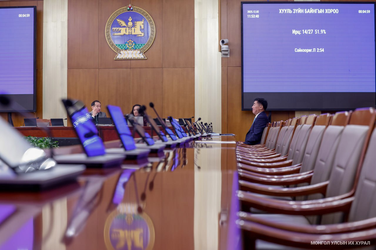 Улсын Их Хурлын Хууль зүйн байнгын хорооны өнөөдрийн (2025.12.02) хуралдаан 11 цаг 51 минутад гишүүдийн 51.9 хувийн ирцтэйгээр эхэлж, гурван асуудал хэлэлцэхээр товлов.