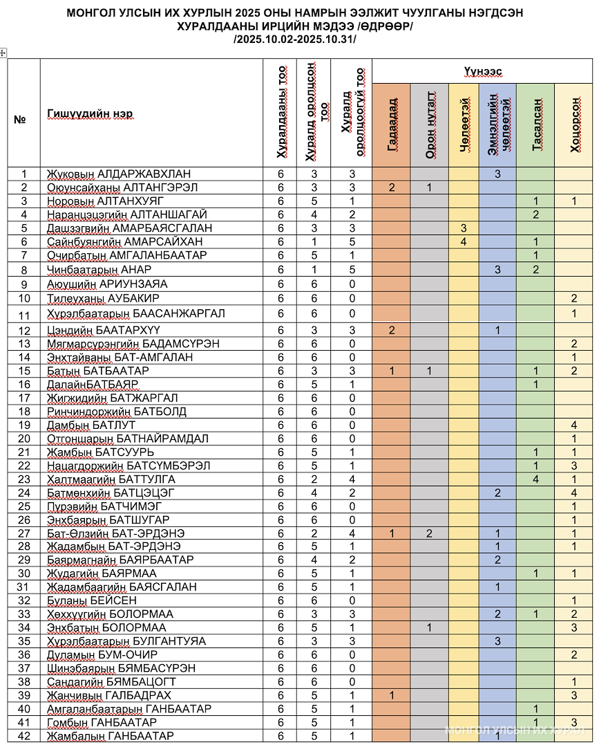 Монгол Улсын Их Хурлын 2025 оны намрын ээлжит чуулганы нэгдсэн хуралдааны 10 дугаар сарын ирцийн мэдээ
