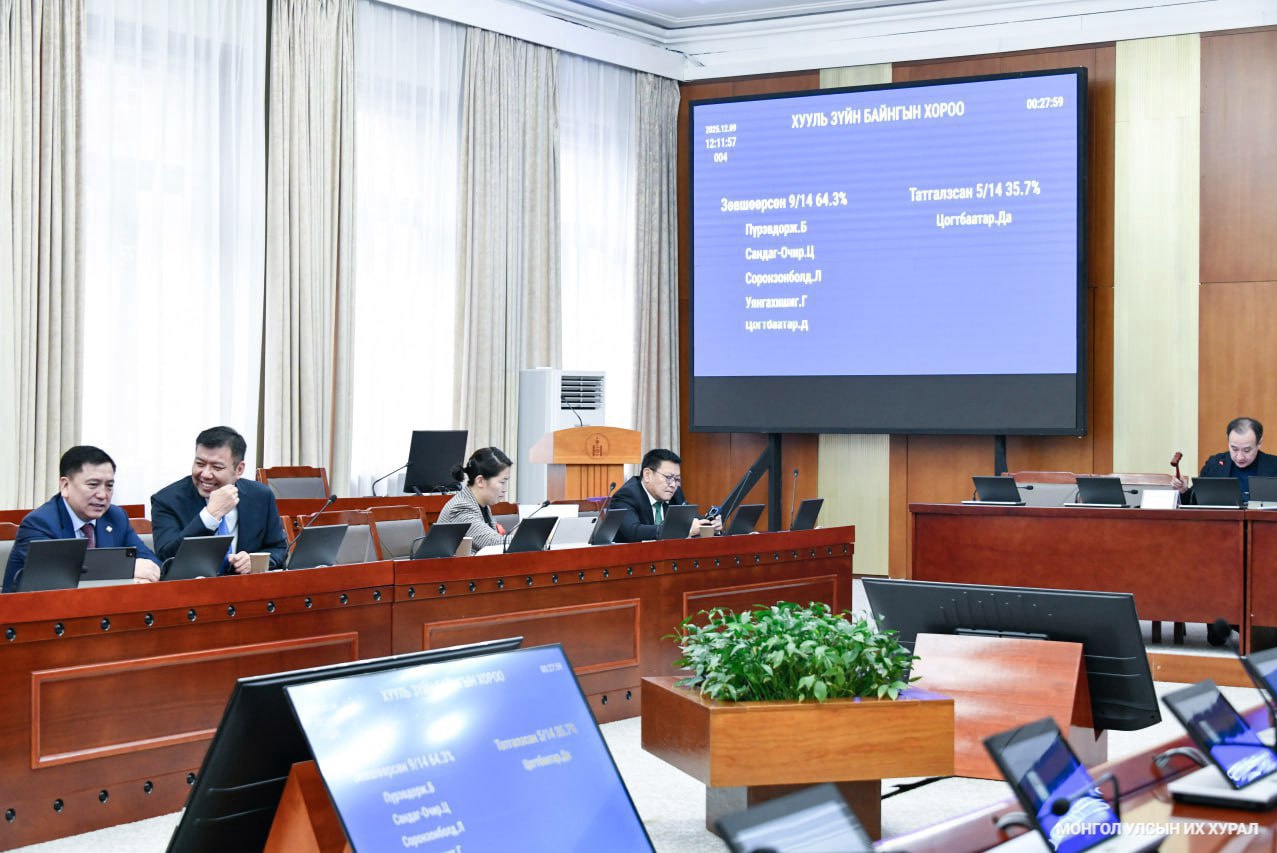 2025.12.09. Хууль зүйн байнгын хороо хуралдлаа. Хуралдаанаар “Тогтоолд нэмэлт оруулах тухай” Улсын Их Хурлын тогтоолын төслийг хэлэлцээд хууль тогтоомжийн тухай хуулийн 27 дугаар зүйлийн 27.1.1 дэх заалт, 28 дугаар зүйлийн 28.3.9 дэх заалттай тус тус зөрчилдсөн гэсэн хууль зүйн зөвлөмжийг дэмжиж, уг санал дүгнэлтээ Төсвийн болон Байгаль орчин, хүнс, хөдөө аж ахуйн байнгын хороонд хүргүүлэхээр боллоо. Үргэлжлүүлэн Засгийн газраас өргөн мэдүүлсэн Гэр бүлийн тухай хуулийн шинэчилсэн найруулгын төслийг хэлэлцүүлэх бэлтгэл хангах үүрэг бүхий ажлын хэсэг байгуулах Байнгын хорооны тогтоолын төслийг хэлэлцэн батлав... https://www.parliament.mn/nn/76243/, https://www.parliament.mn/nn/76244/