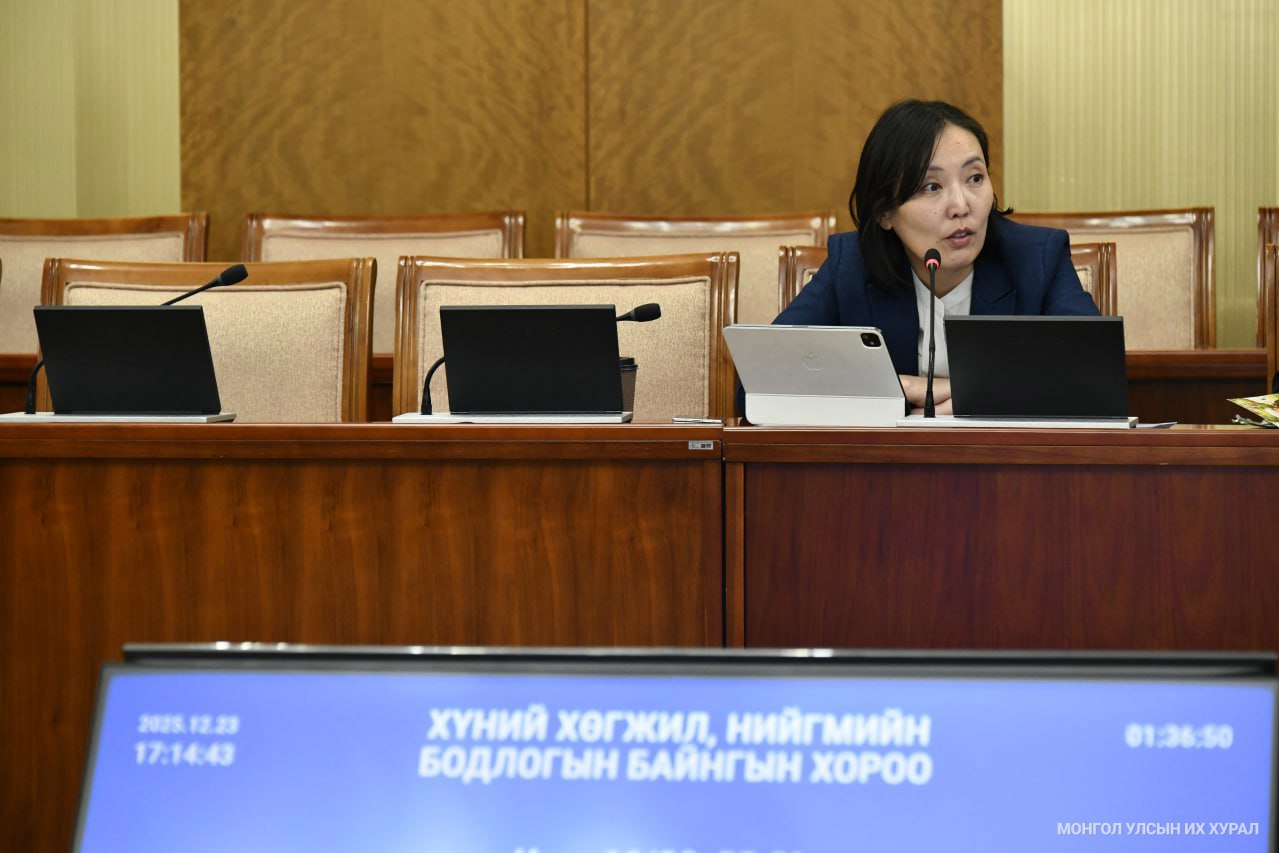 Ажлын хэсгийн ахлагч А.Ариунзаяа, нийгмийн бодлогын хүрээнд жил бүр үнэлгээ, мониторинг хийдэг хэдий ч хэрэгжилт хангалтгүй байдаг. Жишээлбэл, Байнгын хорооны 2016 оны тогтоол тухайн үедээ ач холбогдолтой боловч цаг хугацааны хувьд үүргээ гүйцэтгээд, одоо үүнийг ярих нь оновчтой бус гэдэгтэй санал нийлж байгаа. Мэдээллийн сангаа шинэчлээд явах шаардлагатай. Тиймээс тогтоолын төсөл боловсруулсан хэмээн танилцуулав.