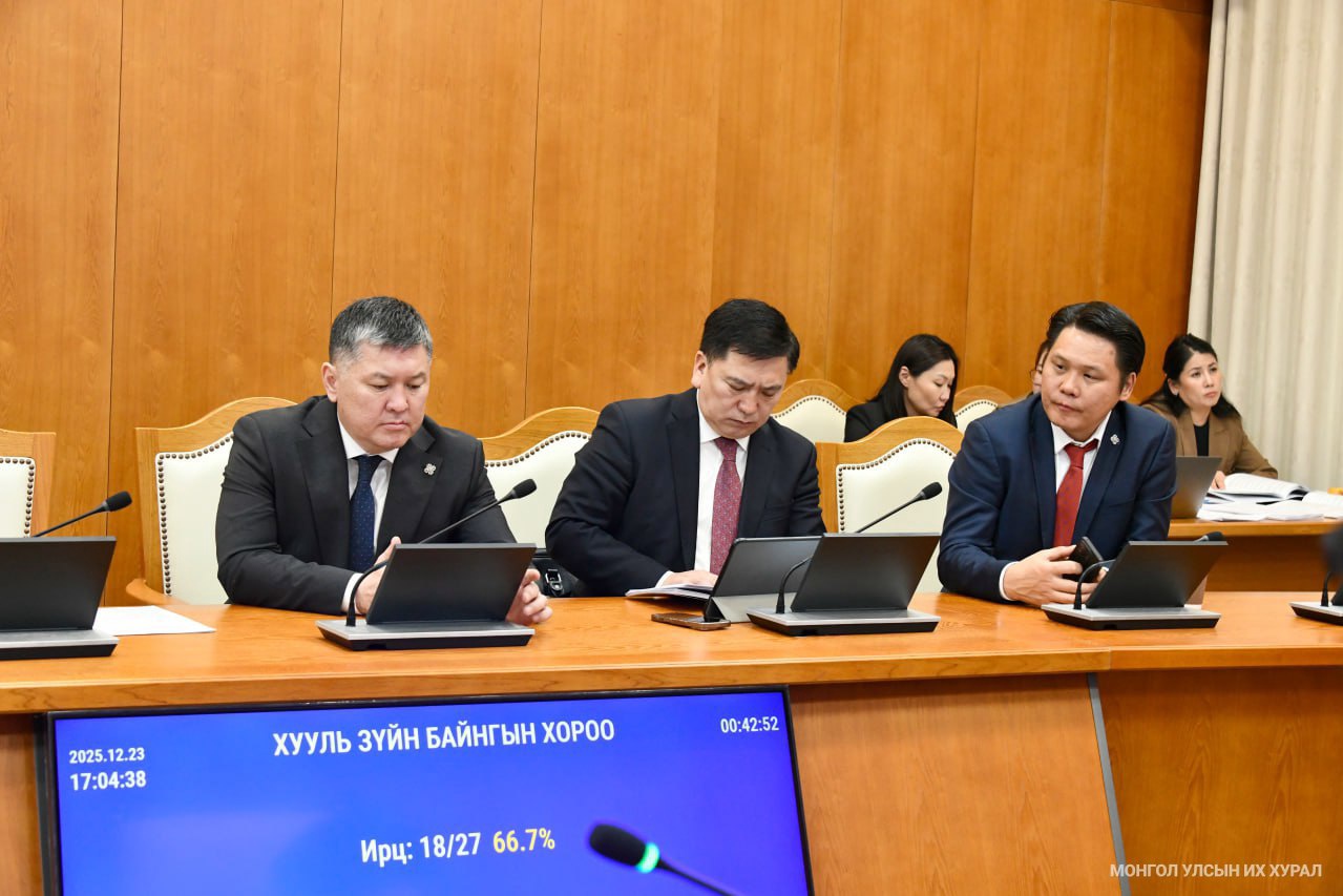 Улсын Их Хурлын Хууль зүйн байнгын хорооны өнөөдрийн (2025.12.23) хуралдаан ирвэл зохих 27 гишүүний 14 нь хүрэлцэн ирснээр 16 цаг 21 минутад эхэллээ. Монгол Улсын Их Хурлын чуулганы хуралдааны дэгийн тухай хуулийн 7 дугаар зүйлийн 7.8 дахь хэсэгт заасны дагуу Байнгын хорооны дарга Д.Цогтбаатар хуралдааны ирцийг танилцуулав. Улсын Их Хурлын гишүүн Н.Алтанхуяг, Х.Баасанжаргал, Э.Батшугар, Б.Баярбаатар, О.Номинчимэг, У.Отгонбаяр, П.Сайнзориг, Ц.Сандаг-Очир, Л.Соронзонболд, Б.Тулга, Х.Тэмүүжин, Г.Уянгахишиг, Дав.Цогтбаатар нар хүрэлцэн ирснээр 51.9 хувийн ирцтэйгээр хуралдаан эхэлж, нэг асуудал хэлэлцэхээр товлов.