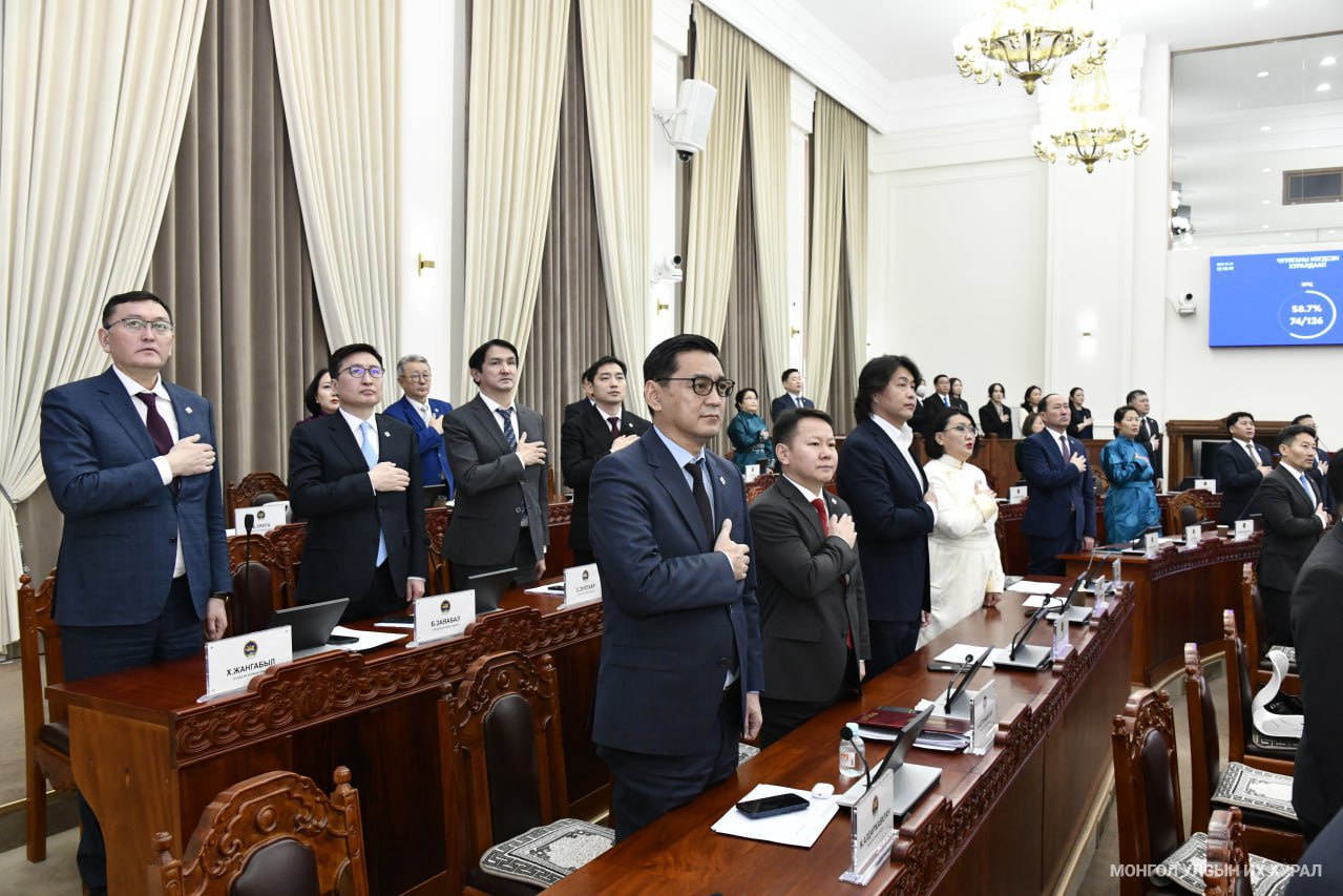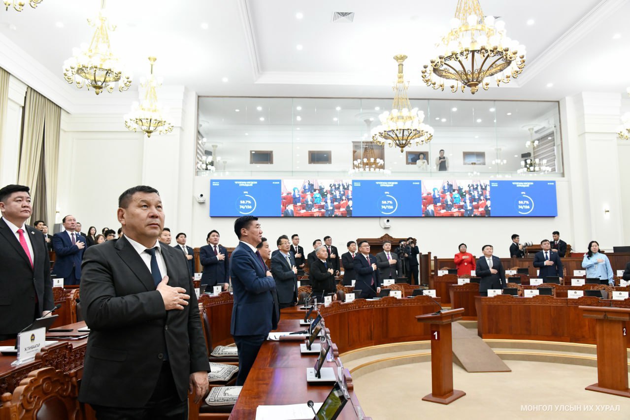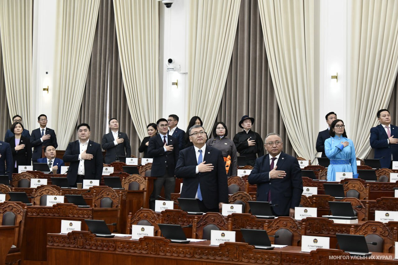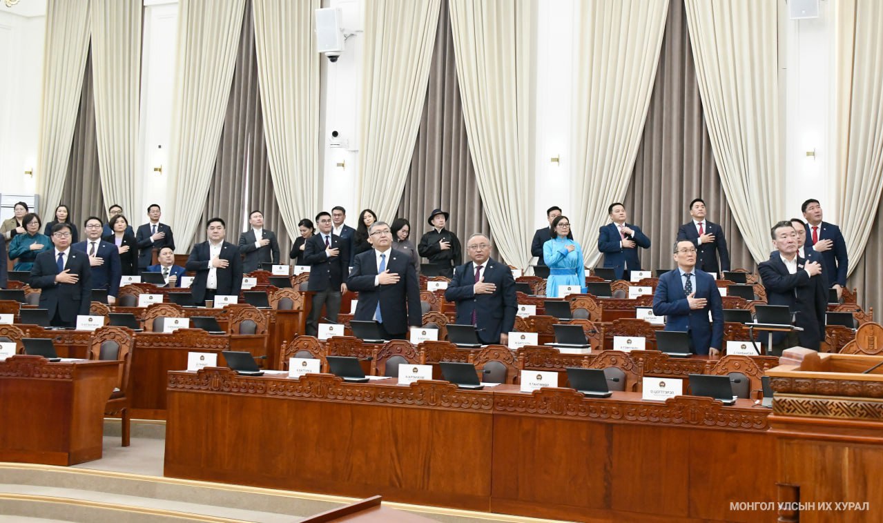Монгол Улсын Төрийн дуулал эгшиглэж, Улсын Их Хурлын гишүүд болон зочид төлөөлөгчид босож хүндэтгэл үзүүлснээр Улсын Их Хурлын 2025 оны намрын ээлжит чуулган өндөрлөв гэж Улсын Их Хурлын Хэвлэл мэдээлэл, олон нийттэй харилцах газраас мэдээллээ.
