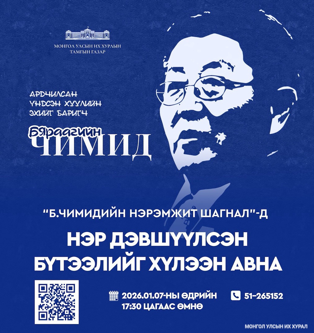 2026.01.02 "Монгол Улсын Үндсэн хуулийн өдөр”-ийг тохиолдуулан Үндсэн хуулийн эхийг баригч, Монгол Улсын Хөдөлмөрийн баатар, Ардын багш, Гавьяат хуульч, доктор, профессор “Бяраагийн Чимидийн нэрэмжит шагнал”-ын 12 дахь удаагийн шалгаруулалтыг зохион байгуулж байна.