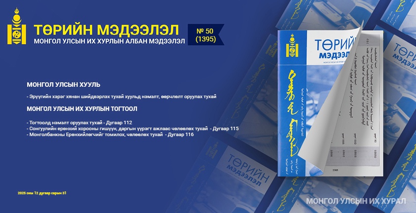 “Төрийн мэдээлэл” эмхэтгэлийн шинэ дугаарт Эрүүгийн хэрэг хянан шийдвэрлэх тухай хуульд нэмэлт, өөрчлөлт оруулах тухай Монгол Улсын хууль болон “Тогтоолд нэмэлт оруулах тухай”, “Сонгуулийн ерөнхий хорооны гишүүн, даргын үүрэгт ажлаас чөлөөлөх тухай”, “Монголбанкны Ерөнхийлөгчийг томилох, чөлөөлөх тухай” Монгол Улсын Их Хурлын тогтоолуудыг нийтэлсэнтэй дэлгэрэнгүй танилцах боломжтой байна. Тухайлбал, Эрүүгийн хэрэг хянан шийдвэрлэх тухай хуульд нэмэлт, өөрчлөлт оруулах тухай Монгол Улсын хуульд доор дурдсан агуулгатай зүйл, хэсэг нэмсэн. Үүнд: 1/14.9 дүгээр зүйлийн 6 дахь хэсэг: “6.Шүүхэд хэрэг хянан шийдвэрлэх ажиллагааны явцад прокурор, оролцогчийн гаргасан саналыг харгалзан шүүх энэ зүйлийн 1, 2, 3, 4 дэх хэсэгт заасан үндэслэлээр, эсхүл хорих ял оногдуулахаар заасан гэмт хэрэг үйлдсэн гэм буруутайд тооцогдсон шүүгдэгчид цагдан хорих таслан сэргийлэх арга хэмжээ авч болно.” Мөн “14.15 дугаар зүйл.Шүүхэд хэрэг хянан шийдвэрлэх ажиллагааны явцад яллагдагч, шүүгдэгчид таслан сэргийлэх арга хэмжээ авах 1.Шүүхэд хэрэг хянан шийдвэрлэх ажиллагааны явцад шүүх энэ хуульд заасны дагуу яллагдагчийг шүүхэд шилжүүлэх, шүүх хуралдааныг хойшлуулах, завсарлуулах, хэргийг түдгэлзүүлэх, тусгаарлах, буцаах, шүүгдэгчийг гэм буруутайд тооцох, эрүүгийн хариуцлага хүлээлгэх асуудлыг шийдвэрлэх үед яллагдагч, шүүгдэгчид авсан таслан сэргийлэх арга хэмжээтэй холбоотой прокурор, оролцогчийн гаргасан санал, хүсэлтийг хэлэлцэн шийдвэрлэнэ. 2.Энэ зүйлийн 1 дэх хэсэгт заасан шүүхийн шийдвэрт яллагдагч, шүүгдэгчид урьд авсан таслан сэргийлэх арга хэмжээг хэвээр үргэлжлүүлсэн, өөрчилсөн, хүчингүй болгосон үндэслэлийг тусгана.” гэсэн болно.