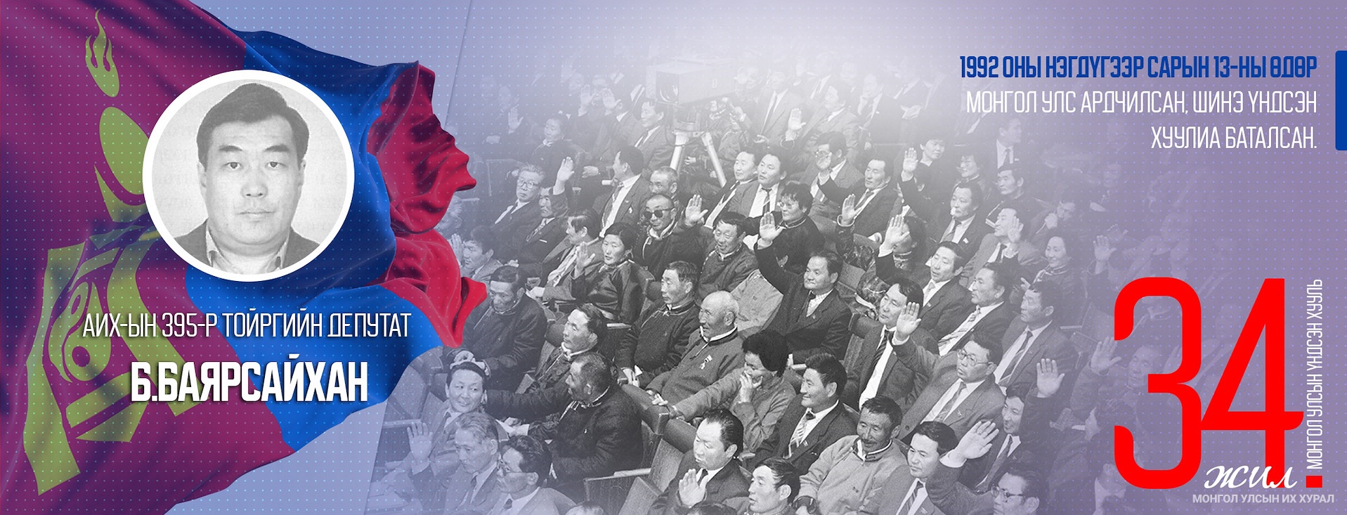 Миний бие нь Хөвсгөл аймгийн Тариалан сумын иргэд, сонгогчдын өндөр итгэл хариуцлагыг хүлээн сонгогдсон үйлдвэрчний эвлэлийн байгууллагын цөөхөн төлөөлөгчдийн нэг болж шинэ Үндсэн хуулийг батлалцахад оролцсон. Улс орныхоо ирээдүйн хөгжлийн чиг хандлагыг тодорхойлох эрх зүйн эцэг хуулийн урт хугацаатай үйлчлэх чадамж, хэв шинжийг Монголын төрт ёсны уламжлалтай хослуулан гаргахад депутатуудтайгаа хамт ажиллаж байсан нь бахархалтай. Нийгэм маань маш хүнд орчин нөхцөлтэй байлаа.