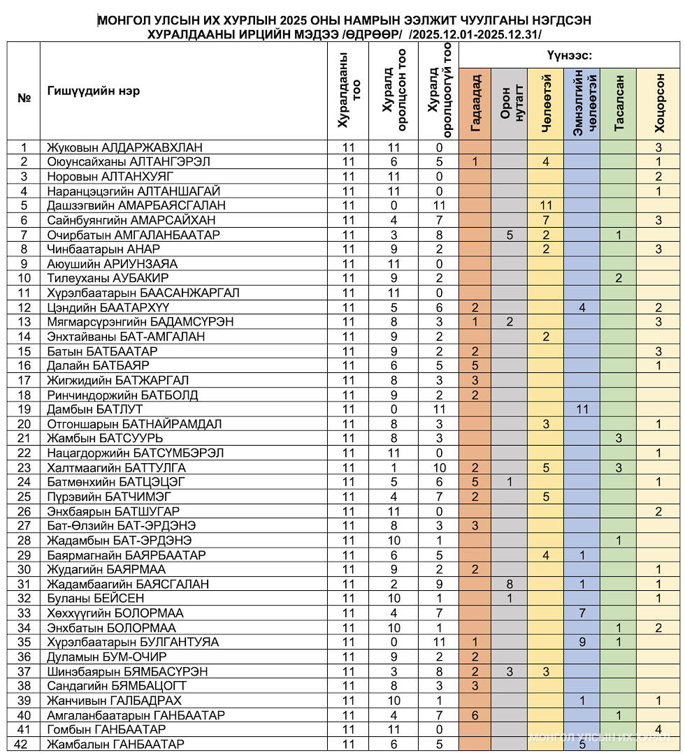 Монгол Улсын Их Хурлын 2025 оны намрын ээлжит чуулганы нэгдсэн хуралдааны 12 дугаар сарын ирцийн мэдээ