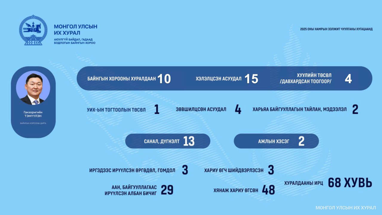 Мөн олон улсын гэрээ, хэлэлцээр, конвенцыг зөвшилцөх гурван асуудлыг хэлэлцэн санал, дүгнэлт, хуралдааны тэмдэглэлээ Монгол Улсын Засгийн газарт, Элчин сайд нарыг эгүүлэн татах, томилох тухай асуудлыг хэлэлцсэн талаарх албан бичгийг Монгол Улсын Ерөнхийлөгчид тус тус хүргүүлжээ.