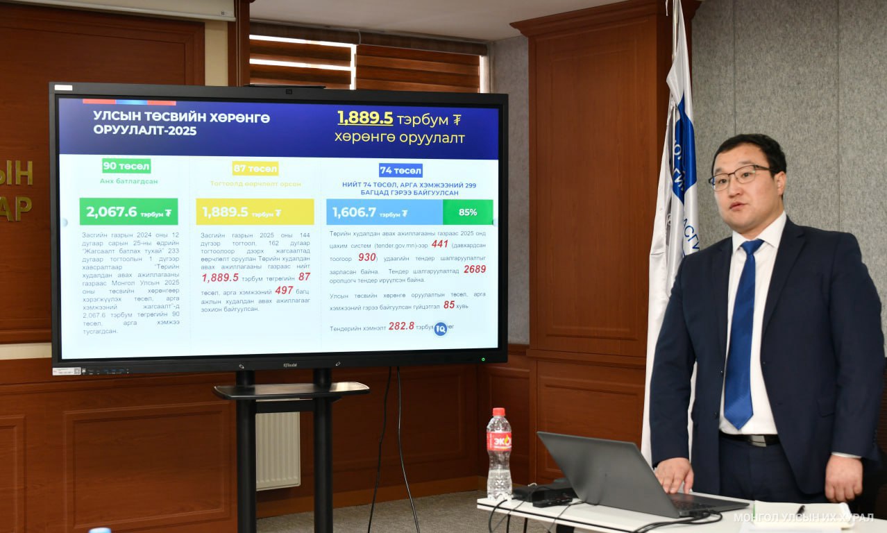 Төрийн Худалдан авах ажиллагааны газрын дарга Ц.Батзул байгууллагынхаа 2025 оны үйл ажиллагааны гүйцэтгэлийн тайлангийн талаар товч мэдээлэл хийхийн зэрэгцээ 2026 онд хэрэгжүүлэх ажлын төлөвлөгөө болон Худалдан авах ажиллагааны тухай хуулийн шинэчилсэн найруулгын төслийн талаар дэлгэрэнгүй танилцуулав. Тухайлбал, “Монгол Улсын 2025 оны төсвийн хөрөнгөөр хэрэгжүүлэх төсөл, арга хэмжээний жагсаалт”-д нийт 2,067.6 тэрбум төгрөгийн 90 төсөл, арга хэмжээ тусгагдсанаас Засгийн газрын 2025 оны 144 дүгээр тогтоол, 162 дугаар тогтоолын жагсаалтад өөрчлөлт оруулан, нийт 1,889.5 тэрбум төгрөгийн 87 төсөл, арга хэмжээний 497 багц ажлын худалдан авах ажиллагааг зохион байгуулахаар төлөвлөсөн байна. Үүнээс нийт 74 төсөл арга хэмжээний хүрээнд гэрээг амжилттай байгуулсны зэрэгцээ улсын төсвийн хөрөнгөөс 282.8 тэрбум төгрөгийн хэмнэлт хийсэн хэмээн танилцуулгад дурдсан байлаа.