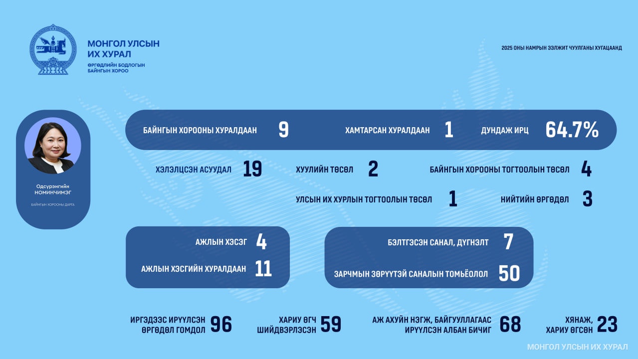 Улсын Их Хурлын 2025 оны намрын ээлжит чуулганы хугацаанд Өргөдлийн байнгын хороо бие даасан ес, Төрийн байгуулалтын байнгын хороотой хамтарсан нэг хуралдаан хийж, нийт 19 асуудал хэлэлцжээ. Үүнд хуулийн хоёр, Улсын Их Хурлын тогтоолын нэг, Байнгын хорооны тогтоолын дөрвөн төсөл, нийтийн гурван өргөдлийг хэлэлцсэн байна.