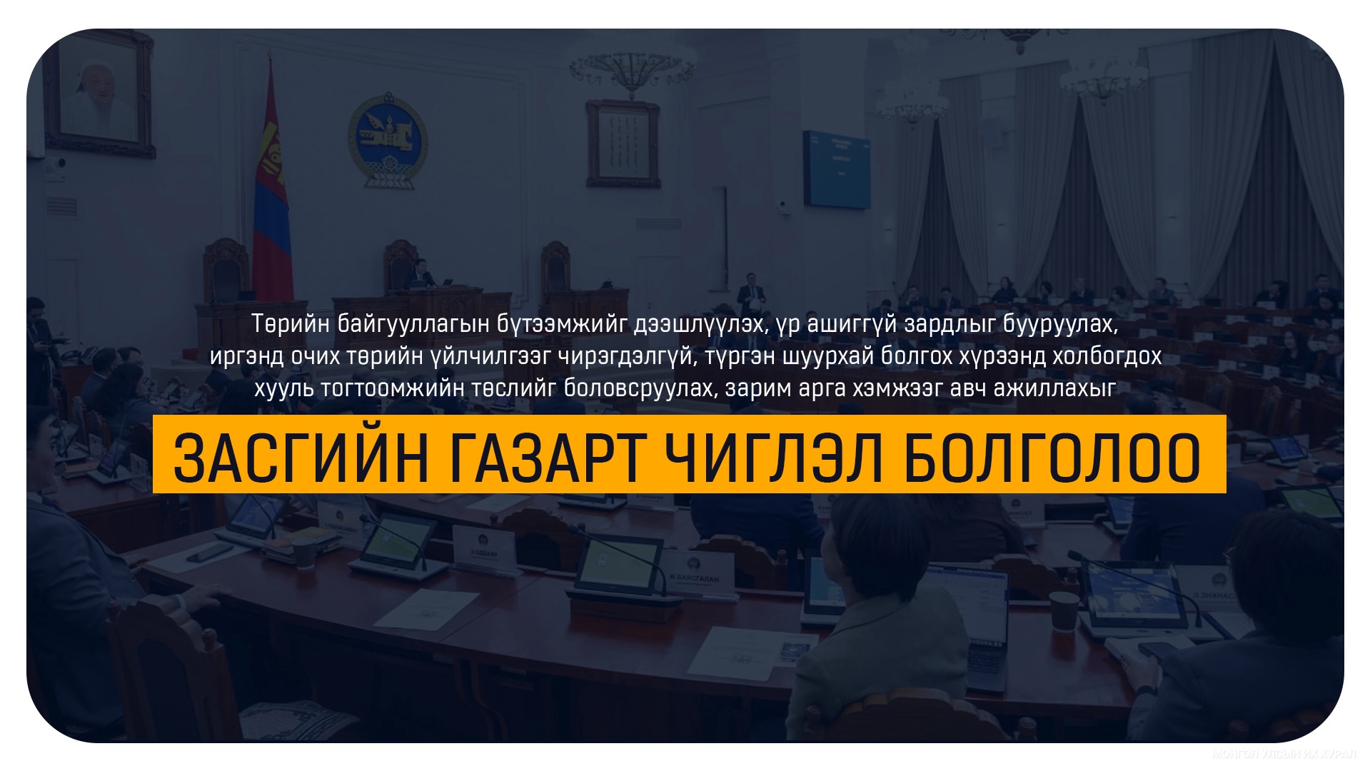 Түүнчлэн төрийн байгууллагын бүтээмжийг дээшлүүлэх, үр ашиггүй зардлыг бууруулах, иргэнд очих төрийн үйлчилгээг чирэгдэлгүй, түргэн шуурхай болгох хүрээнд дараах арга хэмжээг авч хэрэгжүүлэхийг даалгасан: