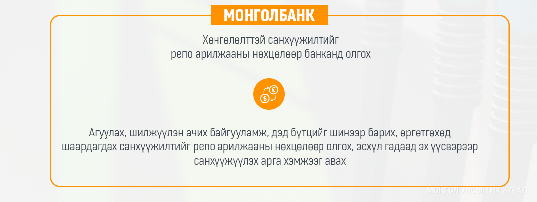 Дээрх зохион байгуулалтын арга хэмжээг хэрэгжүүлэхэд Монголбанкнаас газрын тосны бүтээгдэхүүний нөөцийг нэмэгдүүлэх зорилгоор хадгалах агуулах, шилжүүлэн ачих байгууламж, дэд бүтцийг шинээр барих, өргөтгөхөд шаардагдах санхүүжилт, мөн газрын тосны бүтээгдэхүүний импортын чиглэлээр үйл ажиллагаа эрхлэгч аж ахуйн нэгжид эргэлтийн хөрөнгөд шаардагдах хөнгөлөлттэй санхүүжилтийг репо арилжааны нөхцөлөөр банканд олгох, эсхүл гадаад эх үүсвэрээр санхүүжүүлэх арга хэмжээг авах зэрэг зохицуулалтуудыг тусгасан.