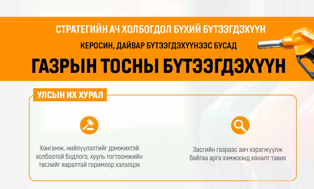 Монгол Улсын Их Хурлаас 2025 оны намрын ээлжит чуулганаар олон улсын худалдааны нөхцөл байдал, гадаад хүчин зүйлсийн нөлөөллөөс шалтгаалан дотоодын зах зээл дээр керосин, дайвар бүтээгдэхүүнээс бусад газрын тосны бүтээгдэхүүний хангамж, нийлүүлэлтийг дэмжих, учирч болзошгүй эрсдэлийг бууруулах, даван туулах арга хэмжээг тодорхойлох, холбогдох шийдвэрийг шуурхай гаргахтай холбогдсон харилцааг зохицуулах Стратегийн ач холбогдол бүхий бүтээгдэхүүний хангамж, нийлүүлэлтийг дэмжих тухай хуулийг баталсан.