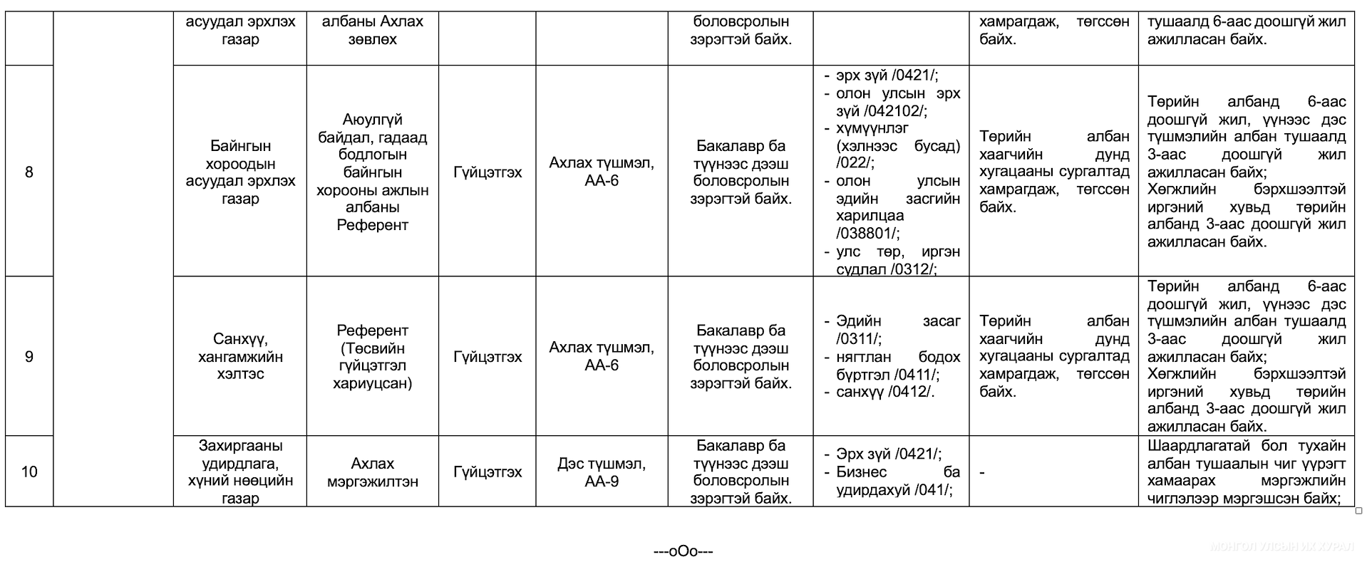 Төрийн албаны зөвлөлийн 2023 оны 25 дугаар тогтоолоор баталсан “Төрийн албаны шалгалт өгөх болзол болон шатлан дэвшүүлэх, сонгон шалгаруулах журам”-ын 4.2-т заасны дагуу төрийн өөр байгууллага, нэгж хооронд шилжин ажиллахыг хүссэн төрийн холбогдох бусад байгууллагад ажиллаж байгаа төрийн жинхэнэ албан хаагчдыг доорх албан тушаалд холбогдох материалаа цахим шуудангийн хаягаар ирүүлэхийг урьж байна.