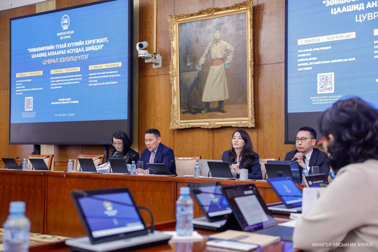 Ийнхүү Улсын Их Хурлын Эдийн засгийн байнгын хороо, Зөвшөөрлийн тухай хуульд нэмэлт, өөрчлөлт оруулах тухай хуулийн төсөл болон хамт өргөн мэдүүлсэн бусад хуулийн төслийг хэлэлцүүлэгт бэлтгэх үүрэг бүхий ажлын хэсгээс 2026 оны 02 дугаар сарын 24, 25, 26-ны өдөр зохион байгуулсан “Зөвшөөрлийн тухай хуулийн хэрэгжилт, цаашид анхаарах асуудал, шийдэл” сэдэвт цуврал хэлэлцүүлгээр байгаль орчин, барилга, хот байгуулалт, зам тээвэр, уул уурхай, хүнд үйлдвэр, эрчим хүч, боловсрол, харилцаа холбоо, банк санхүү зэрэг 16 салбарын зөвшөөрлийн талаарх танилцуулга мэдээллийг холбогдох яам, агентлагуудаас хийж, Зөвшөөрлийн тухай хуулийн хэрэгжилтийн нөхцөл байдал, тулгамдаж буй асуудлыг хөндсөн юм.