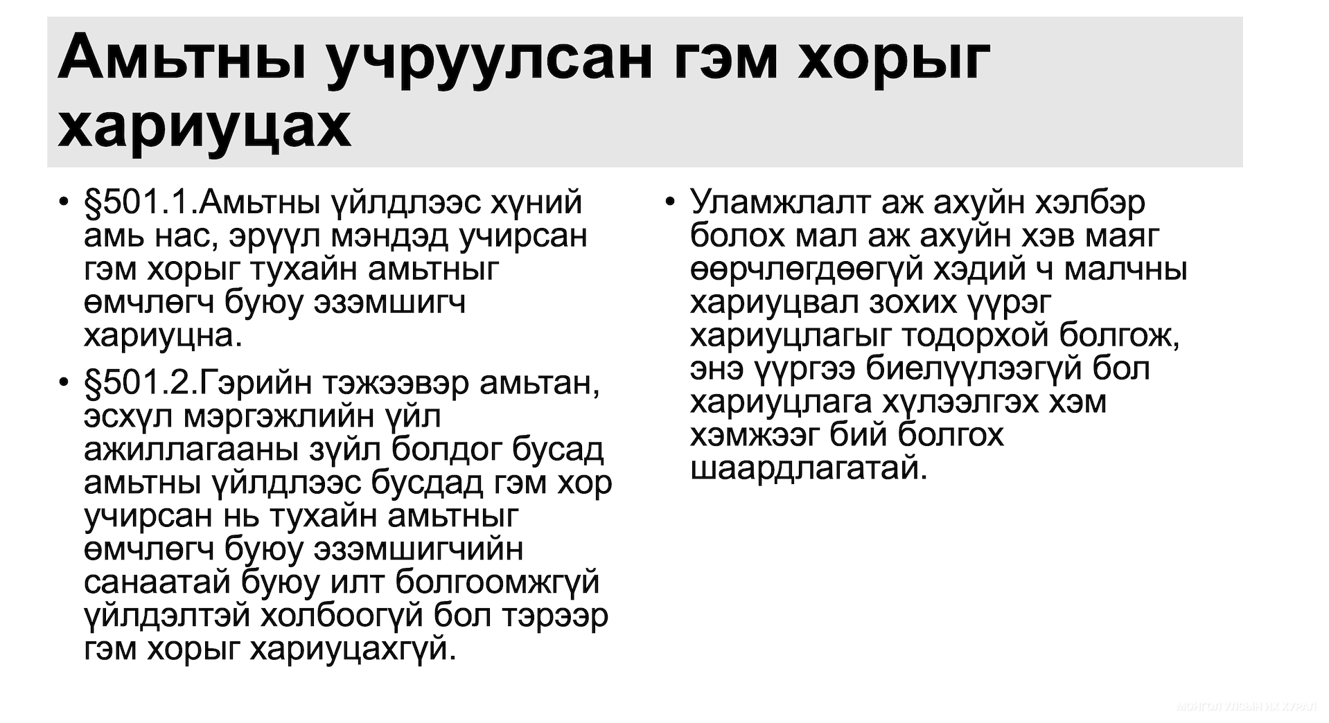 Тэрбээр илтгэлдээ, гэм хорын эрх зүйн үндэслэлгүй хөрөнгөжих гэдэг нь иргэний хуулийн суурь тогтолцоо гэдгийг тодотгоод манай улс 2002 онд Иргэний хууль баталснаас хойш 30 гаруй жил болж буй тул шүүхийн практикт энэ хуулийн хэрэгжилт хэр байгаа талаар судалсан гэв. Гэм хорын эрх зүйн гол онцлог нь ерөнхий ба тусгай зохицуулалтад хуваагддаг бөгөөд нийгэмд учирсан хохирлыг хохирол учруулагчаар нөхөн төлүүлэх зорилготойг тодотголоо.