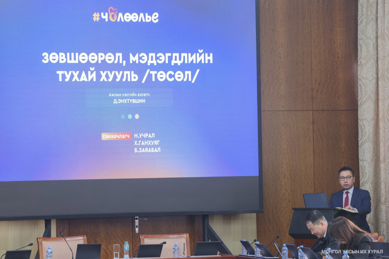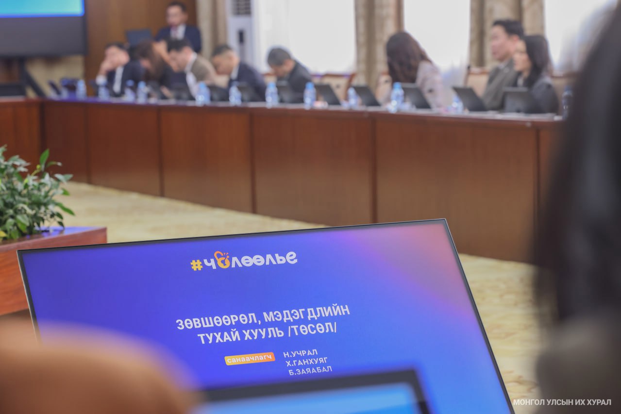 Үргэлжлүүлэн тэрбээр хэлэлцүүлгийн хөтөлбөр, дэгийг танилцуулснаар хэлэлцүүлэг эхэлсэн. Улсын Их Хурлаар хэлэлцэж буй Зөвшөөрлийн тухай хуульд нэмэлт, өөрчлөлт оруулах тухай хуулийн төслийн талаар Улсын Их Хурлын даргын Засаглал, цахим бодлогын зөвлөх С.Тэнгис танилцуулав.
