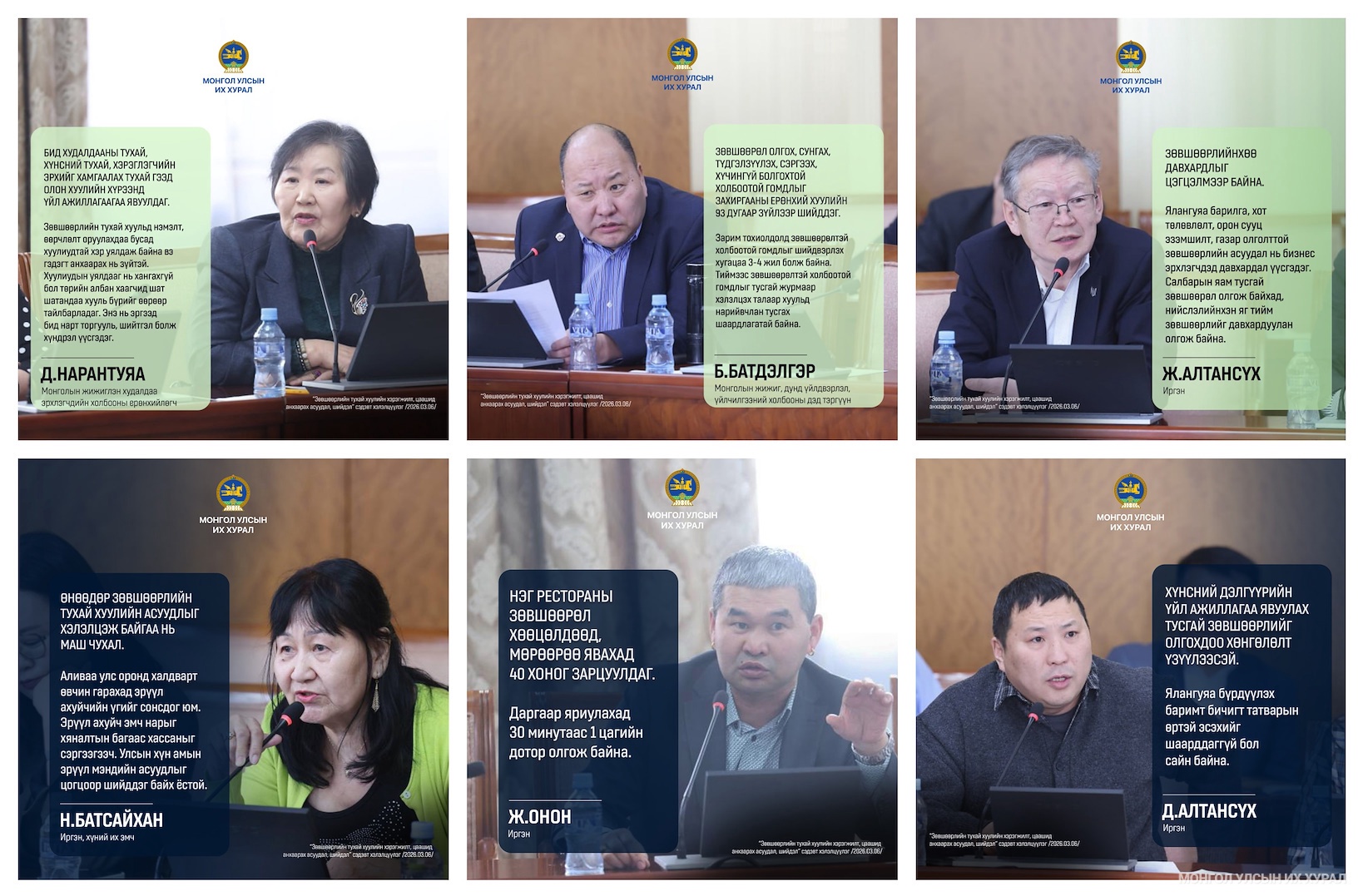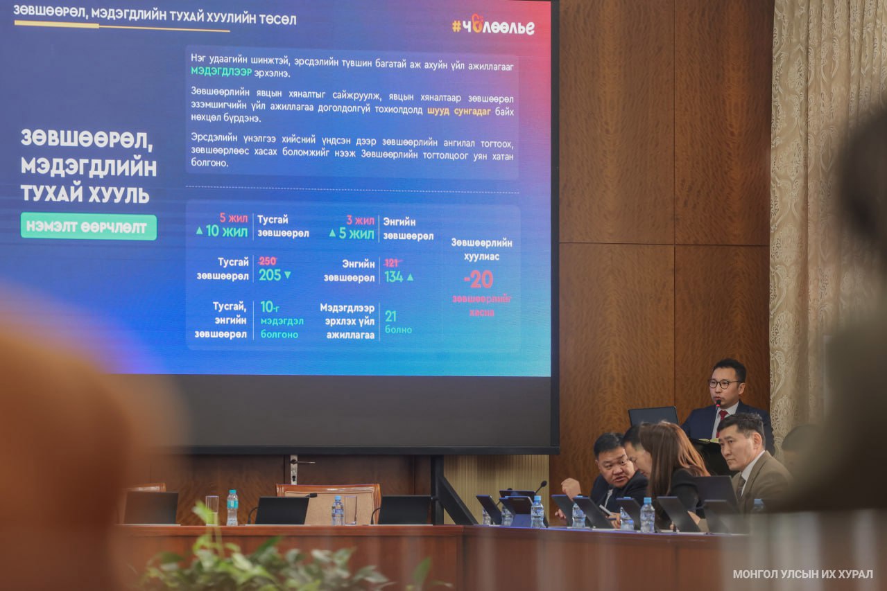 Монгол Улсын Их Хурлын даргын 2026 оны 01 дүгээр сарын 14-ний өдрийн 22 тоот захирамжаар Зөвшөөрлийн тухай хуульд нэмэлт, өөрчлөлт оруулах тухай хуулийн төсөл болон хамт өргөн мэдүүлсэн бусад хуулийн төслийг хэлэлцүүлэгт бэлтгэх үүрэг бүхий ажлын хэсэг төслийг энэ хаврын ээлжит чуулганаар батлуулахаар ажиллаж байгаа бөгөөд Зөвшөөрлийн тухай хуульд нэмэлт, өөрчлөлт оруулах тухай хуулийн төсөл болон хамт өргөн мэдүүлсэн бусад хуулийн төслийн талаарх иргэн, хуулийн этгээдийн саналыг 2026 оны 04 дүгээр сарыг дуустал D.parliament болон цахимаар (QR), албан бичгээр, Засгийн газрын Иргэд, олон нийттэй харилцах 11-11 төвөөр нээлттэй хүлээн авч байгааг тэмдэглэв.