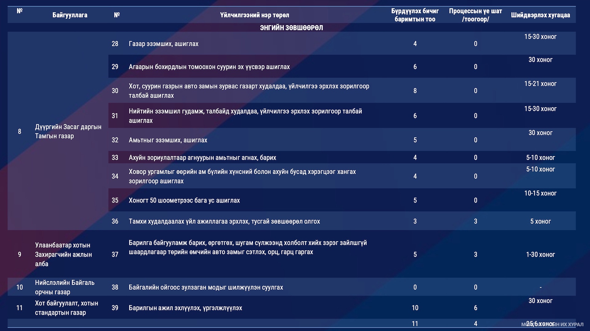 Нийслэл дүүргээс үзүүлж буй аж ахуйн үйл ажиллагааны бүртгэлийн үйлчилгээний мэдээллийг өнөөдрийн хэлэлцүүлэгт оролцогчдод тэрбээр танилцууллаа. Нийслэл, дүүргээс нийт 80 бүртгэлийн үйлчилгээг үзүүлж байна. Үүнээс худалдаа, үйлдвэрлэл, үйлчилгээний 74 нэр төрлийн үйл ажиллагаа, дүгнэлт, акт, тодорхойлолтын зургаан нэр төрлийн үйлчилгээ байдаг аж.