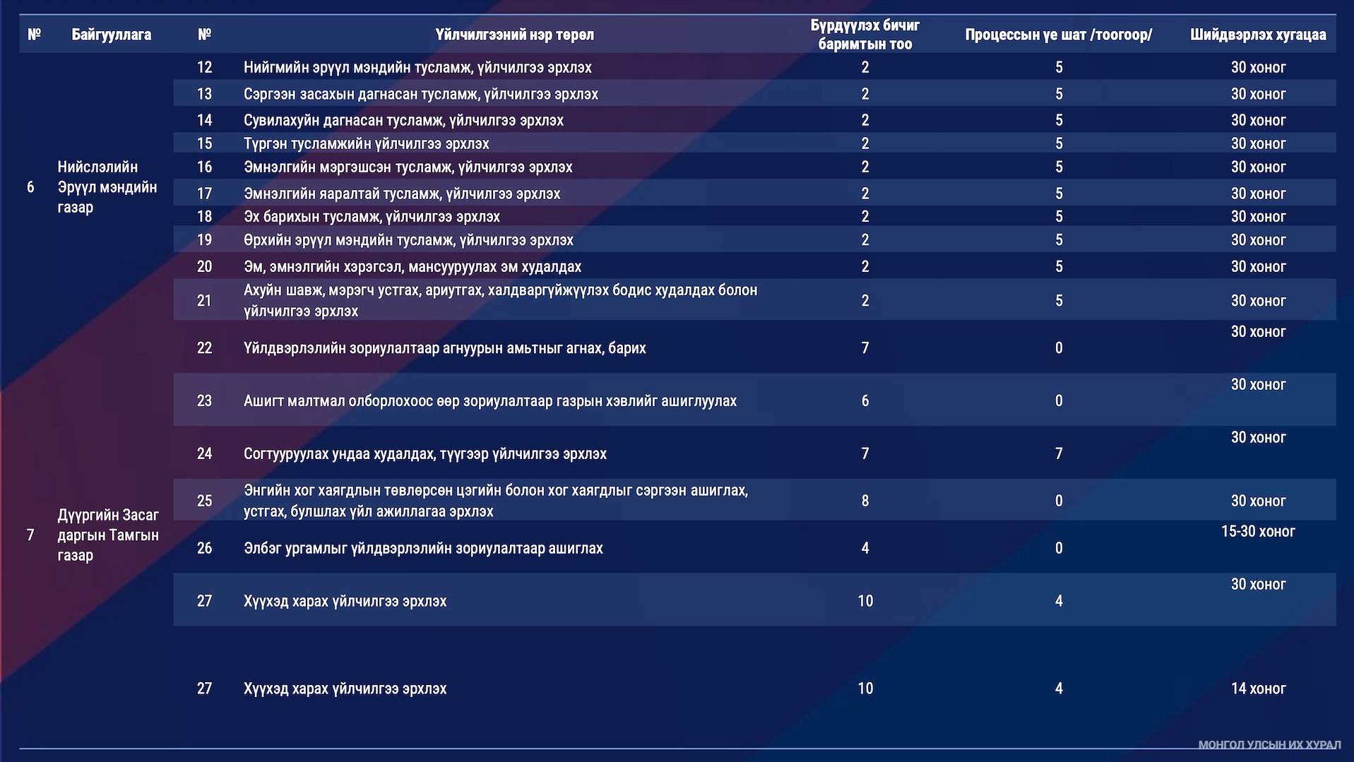 Худалдаа, үйлдвэрлэл, үйлчилгээний чиглэлээр худалдаа; хоол үйлдвэрлэл; ахуйн үйлчилгээ; зочлох үйлчилгээ; чийрэгжүүлэх, бялдаржуулах үйлчилгээ; авто үйлчилгээ; тоглоомын төв; соёл урлагийн үйлчилгээ; үйлдвэрлэл гэсэн есөн чиглэлийн бүртгэлийн үйлчилгээ байдаг юм байна.