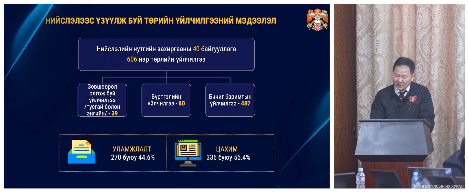 Үргэлжлүүлэн тэрбээр нийслэлээс үзүүлж буй зөвшөөрлийн үйл ажиллагааны талаар танилцуулав. Нийслэл дүүргийн хэмжээнд найман байгууллагын 27 нэр төрлийн тусгай, дөрвөн байгууллагын 12 нэр төрлийн энгийн, нийт 39 нэр төрлийн зөвшөөрлийг олгож байгаа аж. Тусгай зөвшөөрлийг 2-10 бичиг баримтын бүрдэлтэй, 1-4 үе шаттайгаар, 10-30 хоногийн шийдвэрлэж байгаа гэлээ. Энгийн зөвшөөрлүүдийг дунджаар 10 хүртэлх бичиг баримтын бүрдэлтэйгээр, 6 хүртэлх үе шаттайгаар, 30 хоногийн дотор шийдвэрлэж байгаа талаар танилцуулсан. Үргэлжлүүлэн тэрбээр зөвшөөрлийн үйлчилгээг зохицуулж буй эрх зүйн баримт бичгүүд, зохицуулалтын талаар дэлгэрэнгүй танилцуулсан. Мөн зөвшөөрөл олгож буй үйл ажиллагааны цахимжилтын талаар мэдээлэл өгөв. Нийслэлээс үзүүлж буй 39 нэр төрлийн зөвшөөрлөөс 8 байгууллагын 21-ийг e-mongolia.mn, ulaanbaatar.mn, tzmoh.gov.mn, e-gazar.mn, e-barilga.ub.gov.mn, license.mn зэрэг цахим системээр үзүүлж байгаа нь 53.8 хувь аж. Зөвшөөрлийн нэгдсэн license.mn цахим системд нийслэлээс олгосон нийт 2,642 зөвшөөрлийн мэдээллийг нээлттэй байршуулаад байгаа юм байна.