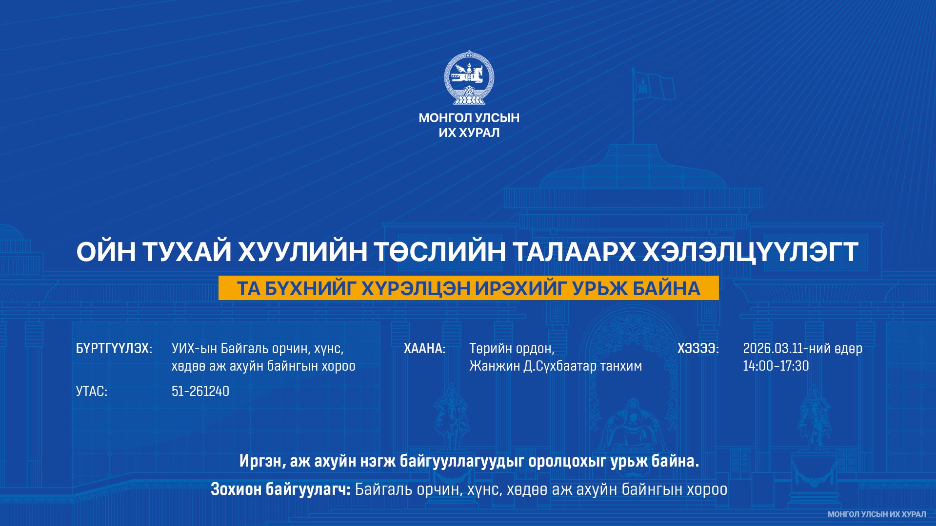 Ойн тухай хуулийн төслийн талаарх хэлэлцүүлэгт Та бүхнийг оролцохыг урьж байна