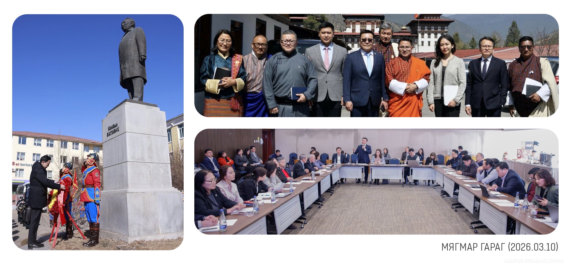 Улсын Их Хурлын гишүүн, Монгол Улсын Их Хурал дахь Монгол-Бутаны парламентын бүлгийн дарга С.Цэнгүүн тэргүүтэй төлөөлөгчид Бутаны Хаант Улсад 2026 оны гуравдугаар сарын 01-06-ны өдрүүдэд айлчлал хийлээ. Айлчлалын үеэр хөндсөн асуудлуудын нэг нь газарзүйн алслагдмал байдал, визийн нөхцөлөөс шалтгаалан хоёр улсын иргэд харилцан зорчиход тодорхой хүндрэл гарч буй учир ард иргэдийн харилцаа холбоог бэхжүүлэх, харилцан зорчих нөхцөлийг хөнгөвчлөх, цаашлаад аялал жуулчлалын салбарыг шинэ түвшинд хүргэх чиглэлээр хамтран ажиллахаа илэрхийллээ... https://www.parliament.mn/nn/76772/
