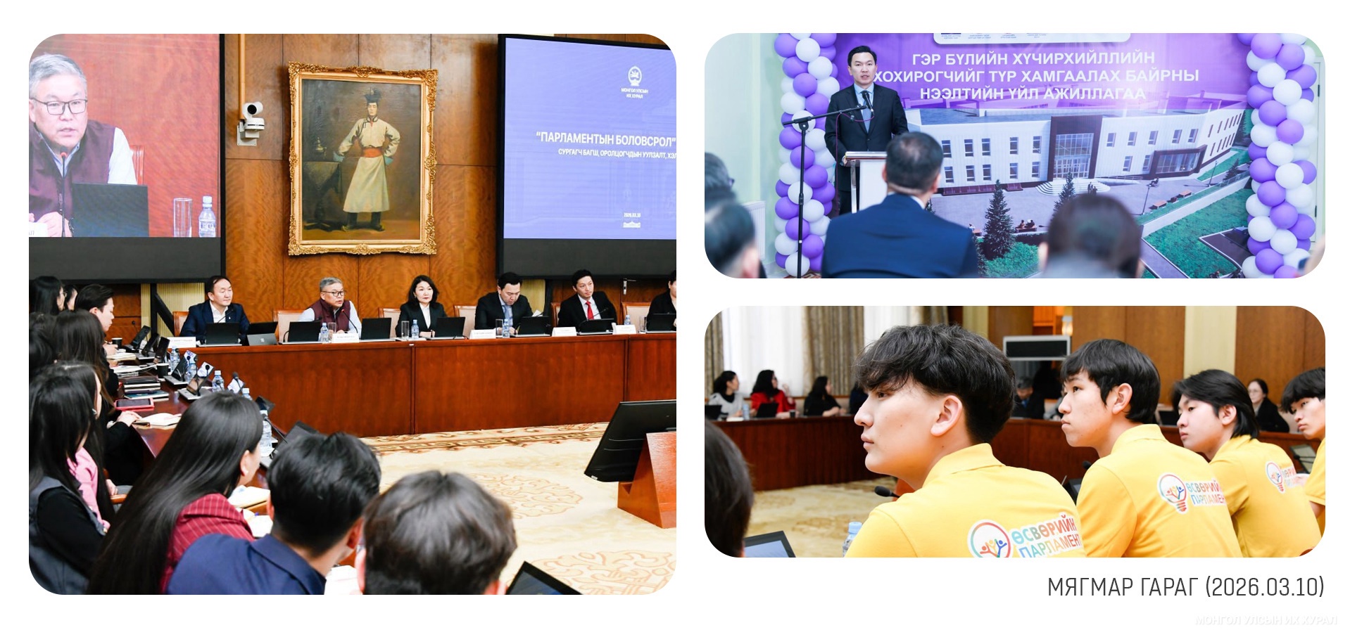 Улсын Их Хурал, түүний Тамгын газрын ил тод, нээлттэй байдлыг нэмэгдүүлэх, парламентын боловсролыг түгээж, төрийн үйл хэрэгт оролцох иргэдийн оролцоог идэвхжүүлэх зорилтын хүрээнд албан ёсоор эхлүүлсэн “Нээлттэй парламент” цогц арга хэмжээний 2026 оны хөтөлбөрийн хүрээнд магадлан итгэмжлэгдсэн их сургууль, коллежийн бакалаврын хоёр, гурав, дөрөвдүгээр ангийнхныг хамруулдаг “Нээлттэй парламент” оюутны дадлагажих хөтөлбөр эхэллээ... https://www.parliament.mn/nn/76780/
