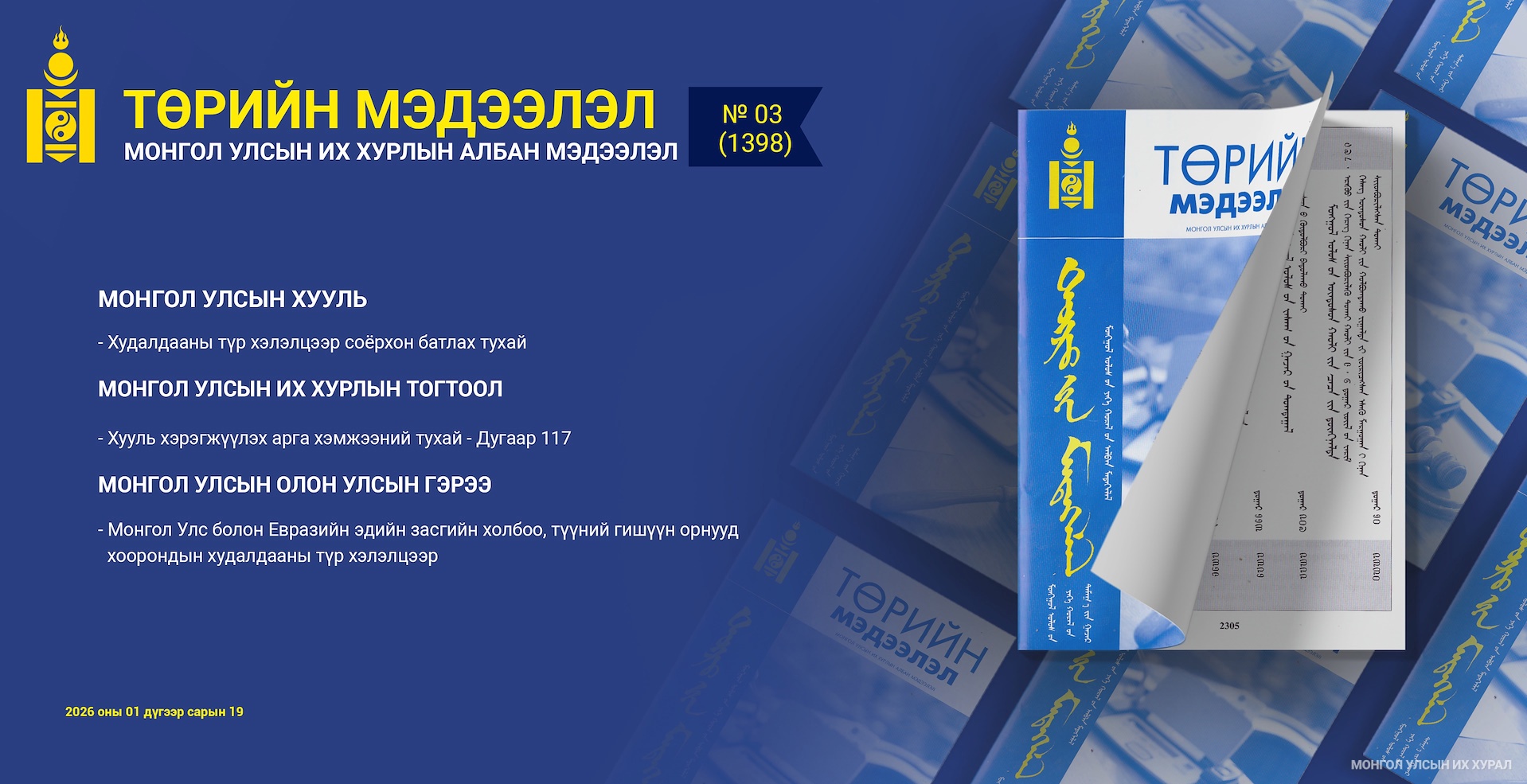 Түүнчлэн эмхэтгэлийн тус дугаарт “Хууль хэрэгжүүлэх арга хэмжээний тухай” Монгол Улсын Их Хурлын тогтоолыг нийтэлсэн. Тус тогтоолоор Монгол Улс болон Евразийн эдийн засгийн холбоо, түүний гишүүн орнууд хоорондын худалдааны түр хэлэлцээр соёрхон батлах тухай хуулийг баталсантай холбогдуулан дараах арга хэмжээг авч хэрэгжүүлэхийг Монгол Улсын Засгийн газарт даалгасан. Үүнд: -худалдааны түр хэлэлцээрээр тамхи агуулсан янжуур болон бусад тамхины гаалийн тарифыг тэглэсэнтэй холбогдуулан нийтийн эрүүл мэнд, эдийн засаг, улсын төсөв, татварт нөлөөлөх үр дагаврын дүн шинжилгээ хийх, тамхины гаалийн тарифыг нөхөх, тамхины онцгой албан татварыг нэмэгдүүлэх тооцооллыг хийж, холбогдох хууль тогтоомжийн төслийг 2026 оны 04 дүгээр сарын 15-ны өдрийн дотор Монгол Улсын Их Хуралд өргөн мэдүүлэх;