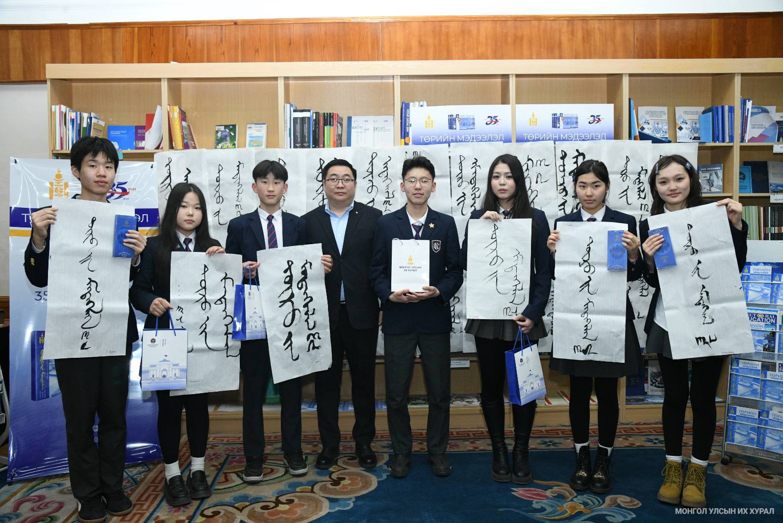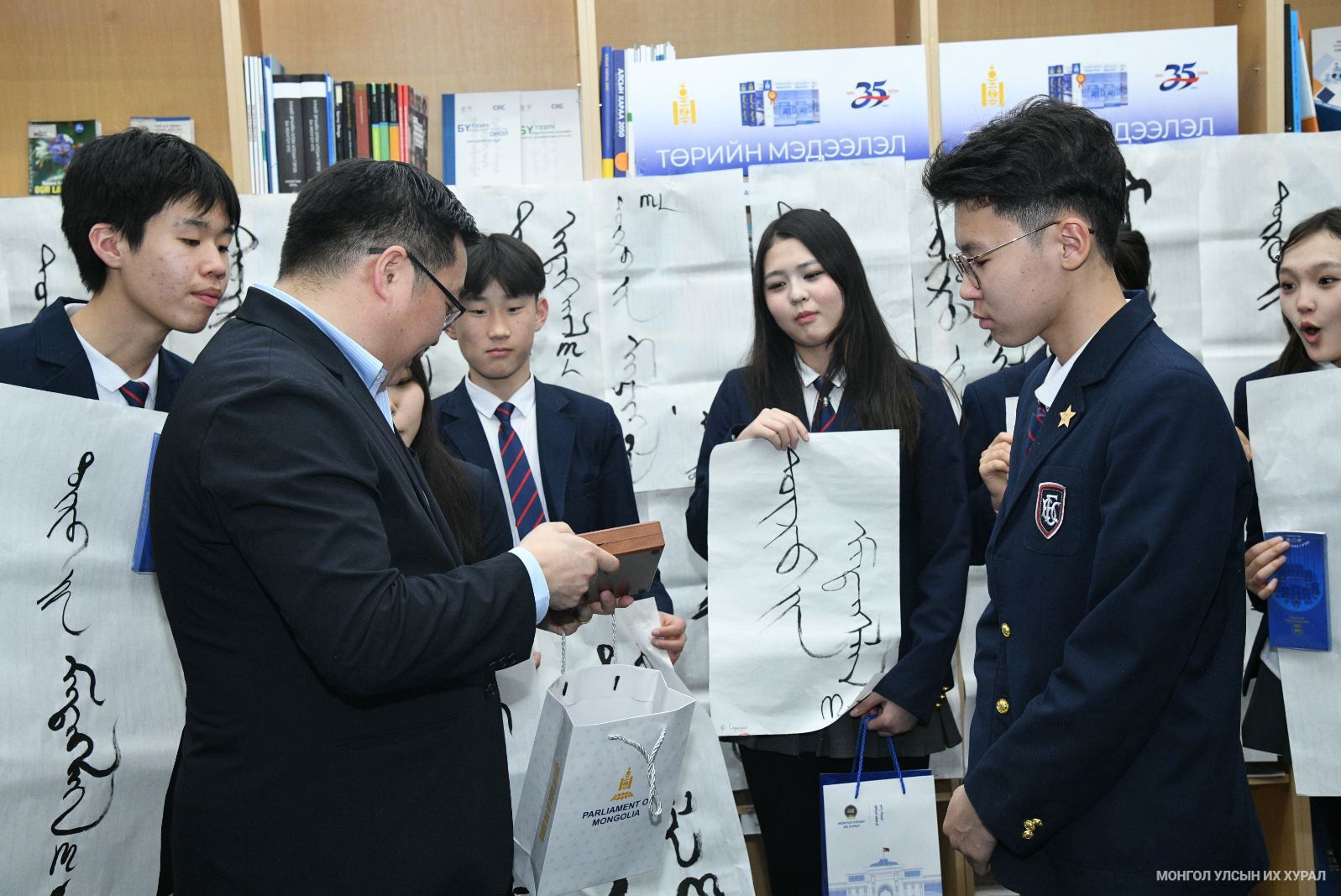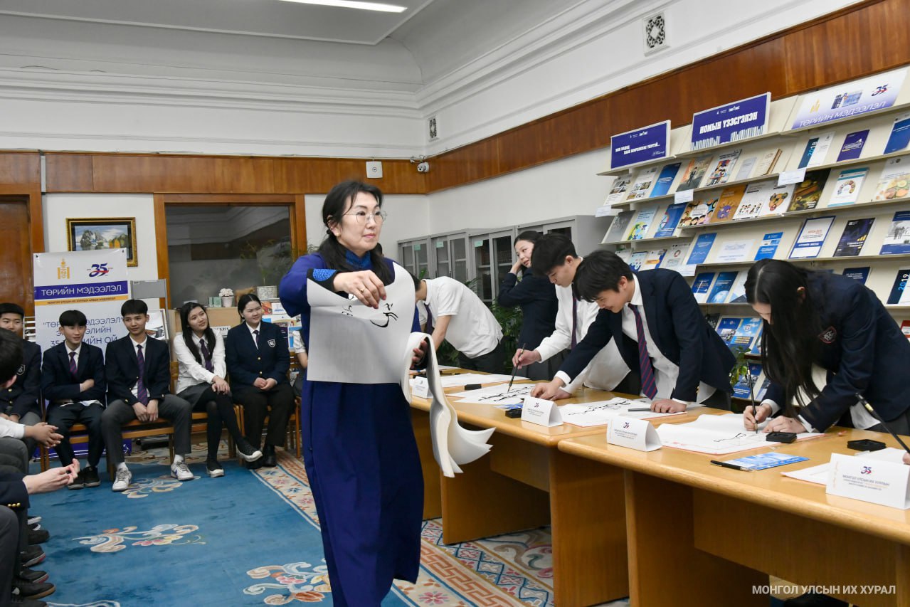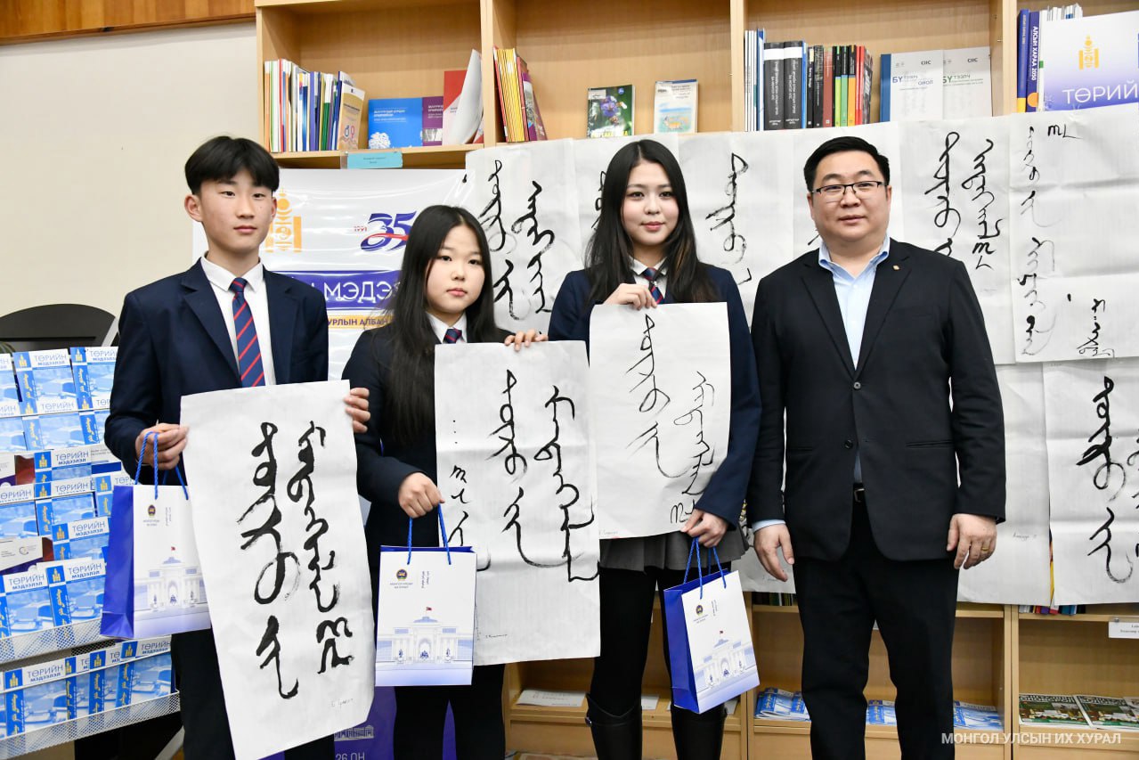 Мөн сурагчид ойн хүрээнд Улсын Их Хурлын Тамгын газраас гаргасан баримт бичиг, хууль, тогтоомжийн эмхэтгэл, сэтгүүлийн үзэсгэлэнг үзэж сонирхсоны зэрэгцээ “Төрийн мэдээлэл-35” хэмээх үгийг монгол бичгээр бичих уран бичлэгийн уралдаанд оролцож, шилдгүүдээ шалгаруулсан юм. Уран бичлэгийн уралдаанд амжилттай оролцсон сурагчдад Улсын Их Хурлын Тамгын газрын Тэргүүн дэд дарга П.Батбаатар дурсгалын зүйлийг гардуулж, Улсын Их Хурлын даргын мэндчилгээг уламжлав.