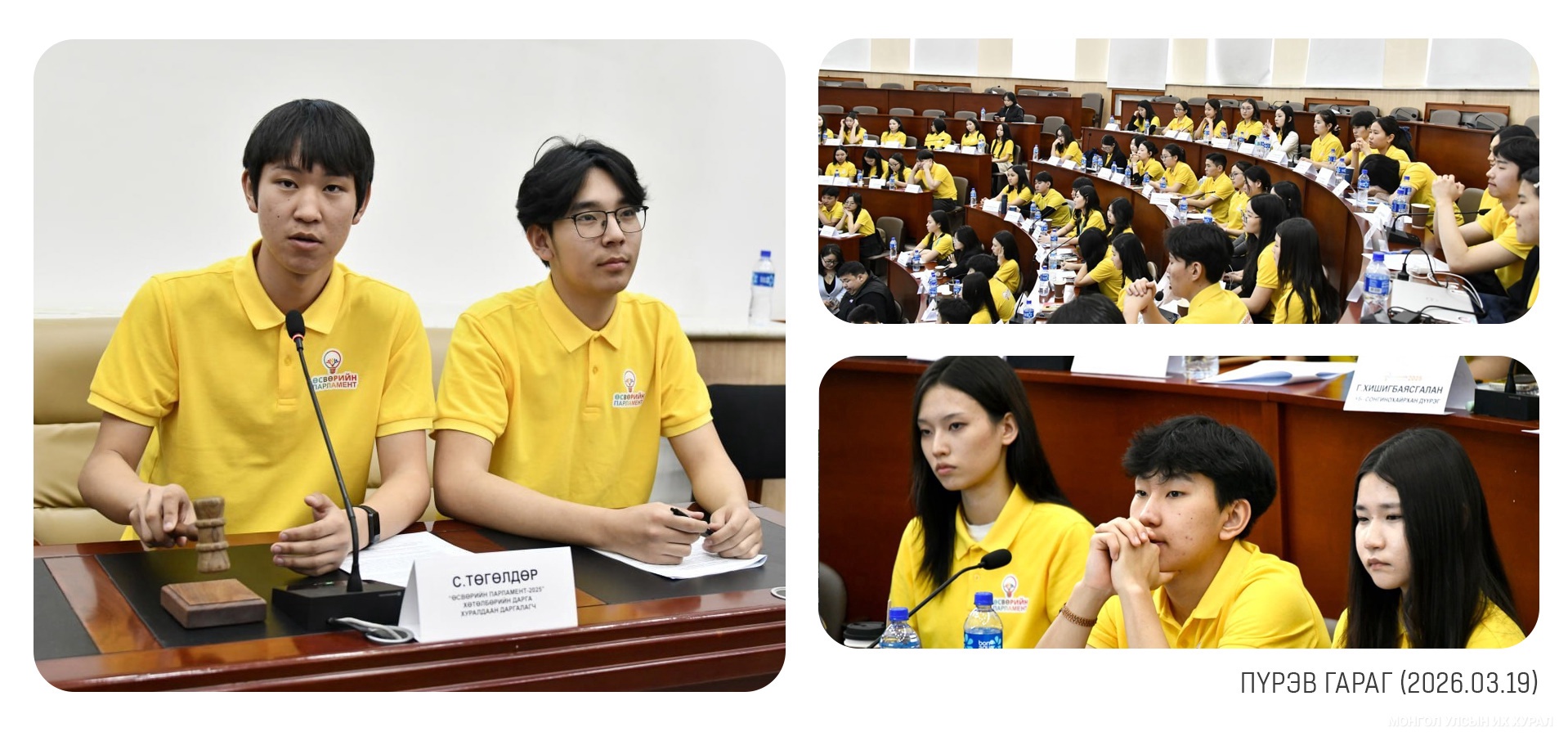 “Өсвөрийн парламент-2025” хөтөлбөрт оролцогчдо хууль тогтоох үйл явцын үе шат, хэлэлцүүлэг, санал хураалтын үйл ажиллагааг бодитоор туршуулах зорилгоор “Загвар чуулган”-ы хуралдааныг зохион байгууллаа. “Загвар чуулган”-ы хуралдаанд танхимаар 70, цахимаар 56 гишүүн оролцож, “Усны нөөцийн судалгаа, хамгаалал, усны нөөцийн нэгдсэн менежментийн асуудал”, “Ус ба тэгш эрх”, “Сургуулийн орчин дахь усан хангамж, ариун цэвэр, эрүүл ахуй” сэдвээр мэдээлэл сонсохын зэрэгцээ асуулт асууж, байр сууриа илэрхийллээ... https://www.parliament.mn/nn/76852/