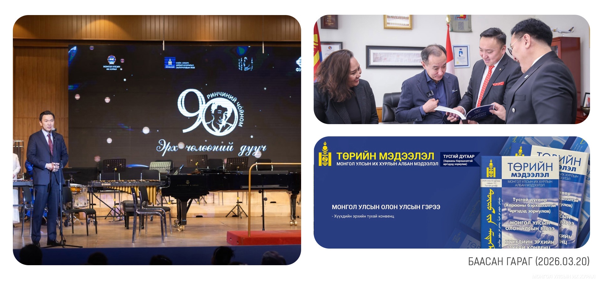 “Төрийн мэдээлэл” эмхэтгэлийн 35 жилийн ой өнөөдөр тохиолоо. Энэхүү эмхэтгэл нь Монгол Улсын Үндсэн хуулиар баталгаажсан албан ёсны хууль цаазын бичиг бөгөөд нийгэм, эдийн засгийн шилжилтийн эгзэгтэй цаг үед ард түмний оюун санаа, нийгмийн хэв журам, дэг ёсыг сахиулж, үндэсний эв нэгдлийг хангахад чухал үүрэг гүйцэтгэснийг Улсын Их Хурлын дарга Н.Учрал чуулганы индрээс онцолж, мэндчилгээ дэвшүүлэв... https://www.parliament.mn/nn/76836/