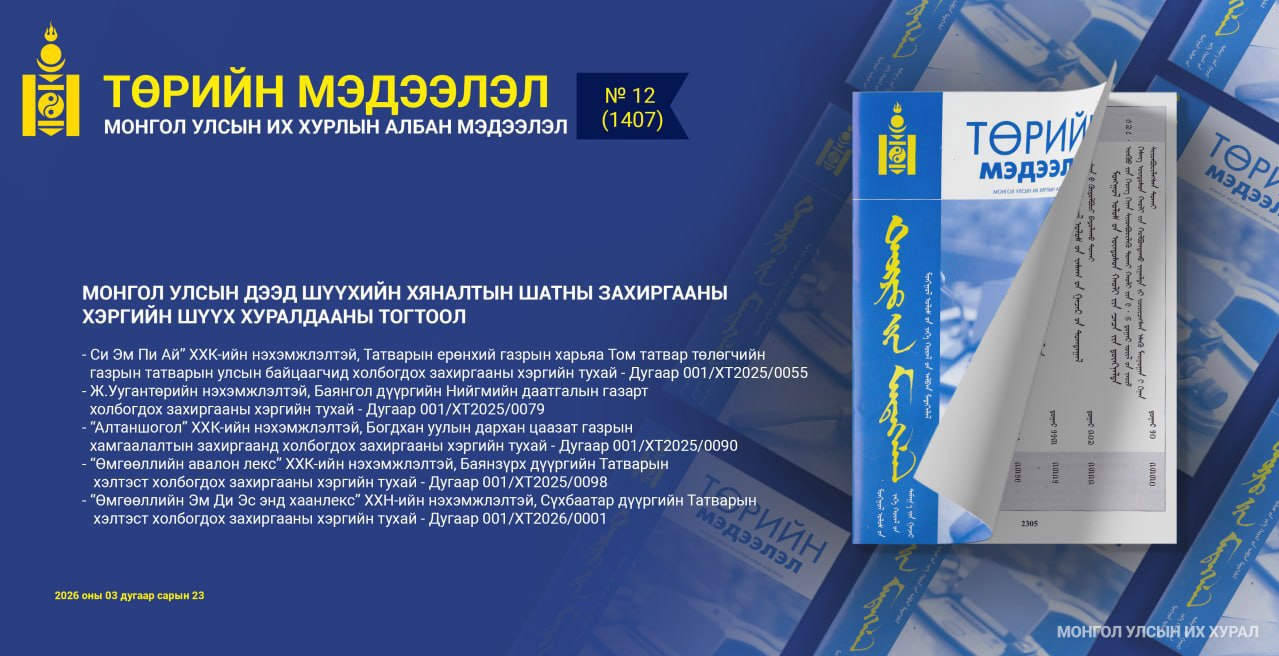 “Төрийн мэдээлэл” эмхэтгэлийн шинэ дугаарт “Си Эм Пи Ай” ХХК-ийн нэхэмжлэлтэй, Татварын ерөнхий газрын харьяа Том татвар төлөгчийн газрын татварын улсын байцаагчид холбогдох захиргааны хэргийн тухай, Ж.Уугантөрийн нэхэмжлэлтэй, Баянгол дүүргийн Нийгмийн даатгалын газарт холбогдох захиргааны хэргийн тухай, “Алтаншогол” ХХК-ийн нэхэмжлэлтэй, Богдхан уулын дархан цаазат газрын хамгаалалтын захиргаанд холбогдох захиргааны хэргийн тухай, “Өмгөөллийн авалон лекс” ХХК-ийн нэхэмжлэлтэй, Баянзүрх дүүргийн Татварын хэлтэст холбогдох захиргааны хэргийн тухай, “Өмгөөллийн Эм Ди Эс энд хаанлекс” ХХН-ийн нэхэмжлэлтэй, Сүхбаатар дүүргийн Татварын хэлтэст холбогдох захиргааны хэргийн тухай Монгол Улсын дээд шүүхийн Хяналтын шатны захиргааны хэргийн шүүх хуралдааны тогтоолуудыг нийтэлсэнтэй дэлгэрэнгүй танилцах боломжтой байна. Тухайлбал, шүүхэд үүссэн эдгээр захиргааны хэргүүдийн нэхэмжлэлийн шаардлага, хэргийн нөхцөл байдал, нэхэмжлэгчийн маргасан үндэслэл, Анхан шатны шүүх ямар үндэслэлээр нэхэмжлэлийн шаардлагыг хэрэгсэхгүй болгож шийдвэрлэсэн, Давж заалдах шатны шүүхийн магадлал болон Хяналтын шатны шүүхээс хянан үзэж, ямар үндэслэлээр шүүхийн шийдвэр, магадлалд өөрчлөлт оруулж, маргаан бүхий актыг түдгэлзүүлж, дахин шинэ акт гаргахыг хариуцагчид даалгасан, эсвэл нэхэмжлэлийн шаардлагын зарим хэсгийг, эсвэл нэхэмжлэлийн шаардлагыг бүхэлд нь хангуулахаар шийдвэрлэн тогтоосон зэргийг мэдэх юм.