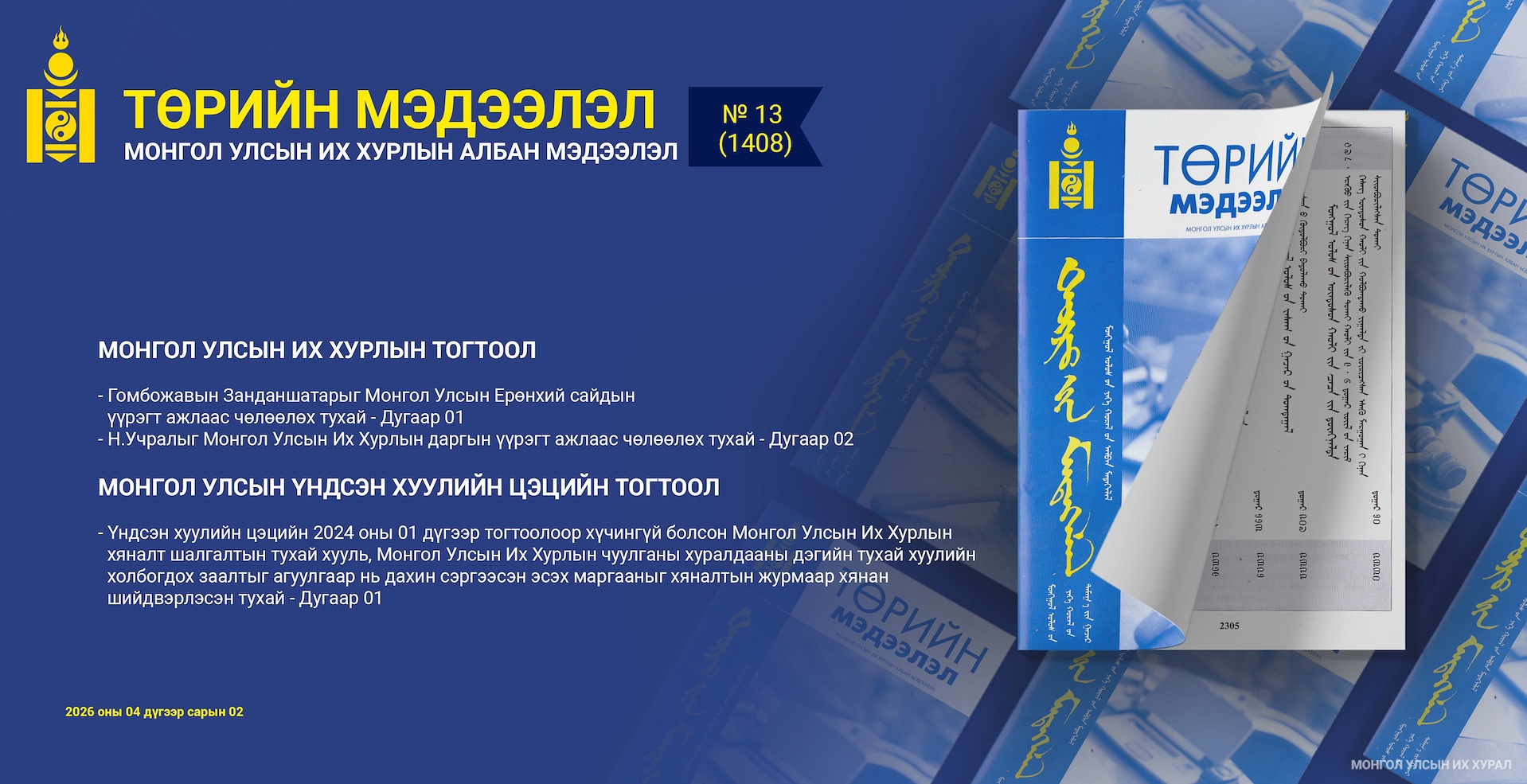 Эмхэтгэлийн шинэ дугаарт “Үндсэн хуулийн цэцийн 2024 оны 01 дүгээр тогтоолоор хүчингүй болсон Монгол Улсын Их Хурлын хяналт шалгалтын тухай хууль, Монгол Улсын Их Хурлын чуулганы хуралдааны дэгийн тухай хуулийн холбогдох заалтыг агуулгаар нь дахин сэргээсэн эсэх маргааныг хяналтын журмаар хянан шийдвэрлэсэн тухай” Монгол Улсын Үндсэн хуулийн цэцийн тогтоолыг нийтэлсэнтэй дэлгэрэнгүй танилцах боломжтой. Тус тогтоолоор Монгол Улсын Үндсэн хуулийн цэцийн 2024 оны 01 дүгээр тогтоолоор хүчингүй болсон Монгол Улсын Их Хурлын хяналт шалгалтын тухай хуулийн 29 дүгээр зүйлийн 29.1.1 дэх заалтад “Үндсэн хуулийн цэцийн гишүүн, …”, 29 дүгээр зүйлийн 29.1.2 дахь заалтад “… эсхүл Улсын Их Хурал танилцах, зөвшилцөх, томилохоор хуульд заасан албан тушаалтны хувьд танилцах, зөвшилцөх, томилгооны сонсгол явуулахаар Улсын Их Хурлын есөөс доошгүй гишүүн хүсэлт гаргасан бол.” гэж заасны “… танилцах, зөвшилцөх, ... танилцах, зөвшилцөх, ...” гэсэн заалтыг Улсын Их Хурал 2024 оны 5 дугаар сарын 16-ны өдөр баталсан Монгол Улсын Их Хурлын хяналт шалгалтын тухай хуулиар агуулгаар нь дахин сэргээсэн байх тул Монгол Улсын Их Хурлын хяналт шалгалтын тухай хууль /Шинэчилсэн найруулга/-ийн 30 дугаар зүйлийн 30.1.1 дэх заалтын “Үндсэн хуулийн цэцийн гишүүн, …”, 30 дугаар зүйлийн 30.1.2 дахь заалтын “... эсхүл Улсын Их Хурал танилцах, зөвшилцөх, томилохоор хуульд заасан албан тушаалтны хувьд танилцах, зөвшилцөх, томилгооны сонсгол явуулахаар Улсын Их Хурлын 15-аас доошгүй гишүүн хүсэлт гаргасан бол.” гэж заасны “... танилцах, зөвшилцөх, ... танилцах, зөвшилцөх, ...” гэсэн заалтыг тус тус хүчингүй болгосон байна. Мөн Үндсэн хуулийн цэцийн 2024 оны 01 дүгээр тогтоолоор хүчингүй болсон Монгол Улсын Их Хурлын чуулганы хуралдааны дэгийн тухай хуулийн 102 дугаар зүйлийн 102.1 дэх хэсэгт “... энэ хуульд заасан журмын дагуу нэр дэвшигчийн сонсгол зохион байгуулна. ... нэр дэвшигчийн сонсголын тайлан гарснаас хойш ... тухайн тайлан, ... Санал, дүгнэлтэд сонсголын тайлангийн агуулгыг өөрчлөхгүйгээр тусгана.” гэсэн заалтыг Улсын Их Хурал 2024 оны 5 дугаар сарын 16-ны өдөр баталсан Монгол Улсын Их Хурлын чуулганы хуралдааны дэгийн тухай хуулиар агуулгаар нь дахин сэргээсэн байх тул Монгол Улсын Их Хурлын чуулганы хуралдааны дэгийн тухай хууль /Шинэчилсэн найруулга/-ийн 104 дүгээр зүйлийн 104.1 дэх хэсгийн “... энэ хуульд заасан журмын дагуу нэр дэвшигчийн сонсгол зохион байгуулна. ... нэр дэвшигчийн сонсголын тайлан гарснаас хойш ... тухайн тайлан, …” гэсэн заалтыг хүчингүй болгожээ хэмээн УИХ-ын Хэвлэл мэдээлэл, олон нийттэй харилцах газраас мэдээллээ.
