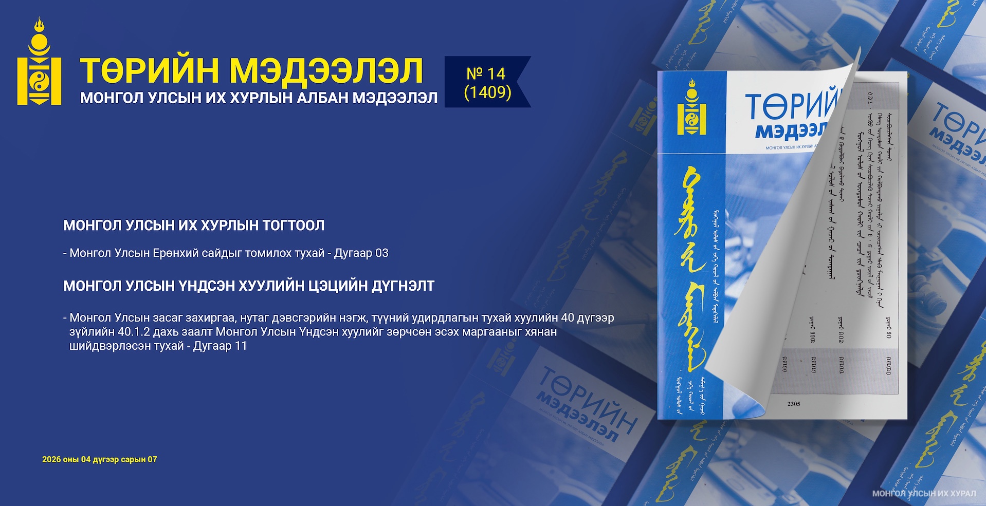 Мөн энэхүү эмхэтгэлд “Монгол Улсын засаг захиргаа, нутаг дэвсгэрийн нэгж, түүний удирдлагын тухай хуулийн 40 дүгээр зүйлийн 40.1.2 дахь заалт Монгол Улсын Үндсэн хуулийг зөрчсөн эсэх маргааныг хянан шийдвэрлэсэн тухай” Монгол Улсын Үндсэн хуулийн цэцийн дүгнэлтийг нийтэлсэнтэй дэлгэрэнгүй танилцах боломжтой. Тус дүгнэлтээр “Монгол Улсын засаг захиргаа, нутаг дэвсгэрийн нэгж, түүний удирдлагын тухай хуулийн 40 дүгээр зүйлийн 40.1.2 дахь заалтад “өөр шатны иргэдийн Төлөөлөгчдийн Хурлын төлөөлөгч байх.” гэсэн нь Монгол Улсын Үндсэн хуулийн Арван зургадугаар зүйлийн 9 дэх заалтад “шууд буюу төлөөлөгчдийн байгууллагаараа уламжлан төрийг удирдах хэрэгт оролцох эрхтэй. Төрийн байгууллагад сонгох, сонгогдох эрхтэй. ...”, Арван есдүгээр зүйлийн 1 дэх хэсэгт “Төрөөс хүний эрх, эрх чөлөөг хангахуйц эдийн засаг, нийгэм, хууль зүйн болон бусад баталгааг бүрдүүлэх, хүний эрх, эрх чөлөөг зөрчихтэй тэмцэх, хөндөгдсөн эрхийг сэргээн эдлүүлэх үүргийг иргэнийхээ өмнө хариуцна.”, Далдугаар зүйлийн 1 дэх хэсэгт “Үндсэн хуульд хууль, зарлиг, төрийн байгууллагын бусад шийдвэр, нийт байгууллага, иргэний үйл ажиллагаа бүрнээ нийцсэн байвал зохино.” гэж заасанд тус тус нийцсэн байна.” хэмээн гарсан тухайд УИХ-ын Хэвлэл мэдээлэл, олон нийттэй харилцах газраас мэдээллээ.