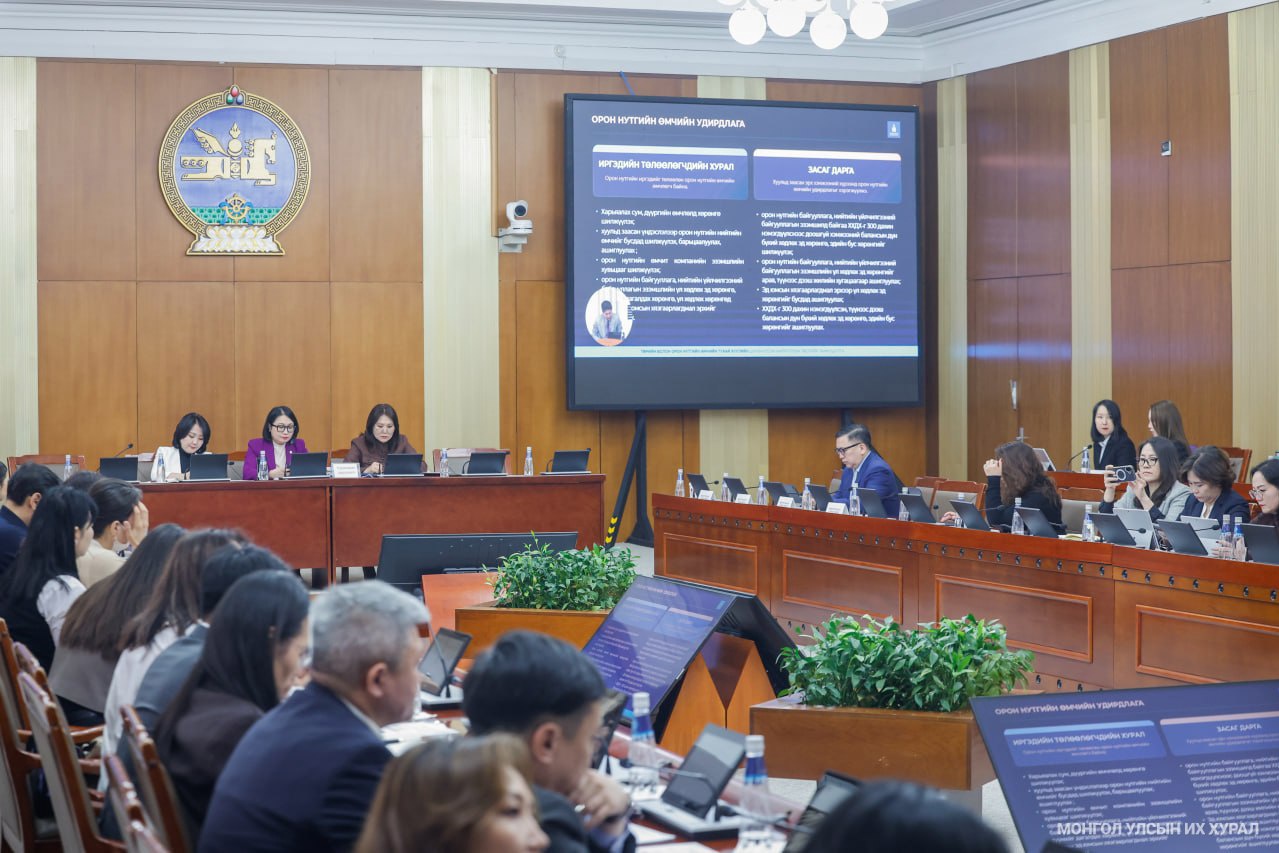 Түүнчлэн өнөөдрийн хэлэлцүүлэгт Төрийн өмчийн бодлого, зохицуулалтын газраас “Төрийн болон орон нутгийн өмчийн ангилал, удирдлагатай холбоотой өнөөгийн нөхцөл байдал, тулгамдаж буй асуудал” сэдвээр мэдээлэл хийв. Төрийн нийтийн өмчид иргэдэд өмчлүүлснээс бусад газар; газрын хэвлий, түүний баялаг; ой, түүний дагалдах баялаг; ус, түүний доторх баялаг; ургамал, ан амьтны нөөц; түүх, соёлын үнэт цогцолбор, хөшөө дурсгал; археологийн болон палеонтологийн олдвор; хуулиар нийтийн зориулалтаар ашиглахаар тогтоосон бусад эд хөрөнгө багтдаг. Харин төрийн өөрийн өмчид төрийн байгууллага, албан газарт эзэмшүүлсэн эд хөрөнгө, төрийн өмчит үйлдвэрийн газарт эзэмшүүлсэн эд хөрөнгө, төрийн өмчийн оролцоотой аж ахуйн нэгжийн төрд ногдох хувь хөрөнгө, улсын төсвийн хөрөнгө болон төрийн бусад тусгай сан, төрийн тусгай хэрэгцээний бэлтгэл нөөц, хуульд заасан бусад төрийн болон орон нутгийн өмчит төрөлжсөн мэргэшлийн эмнэлэг, нэгдсэн эмнэлгийн үл хөдлөх болон хөдлөх хөрөнгө хамаарч байна. Нийгэм, эдийн засгийн өөрчлөлттэй холбоотойгоор өмчийн харилцааны эрх зүйн зохицуулалтад томоохон өөрчлөлтүүд гарсаар ирсэн.