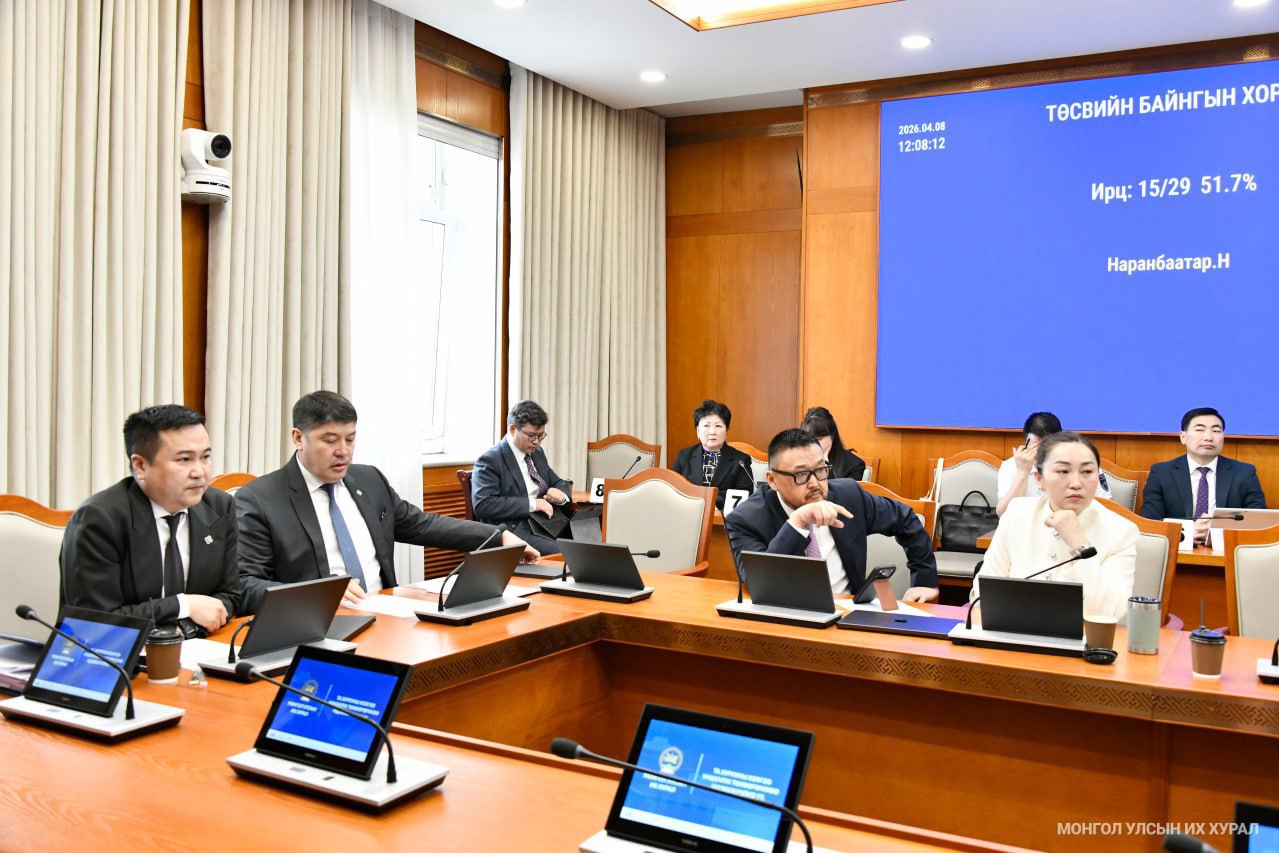 Улсын Их Хурлын Төсвийн байнгын хорооны өнөөдрийн /2026.04.08/ хуралдаан 10 цаг 26 минутад, ирвэл зохих Улсын Их Хурлын 29 гишүүний 15 нь буюу 51.7 хувь нь хүрэлцэн ирснээр эхэллээ.
