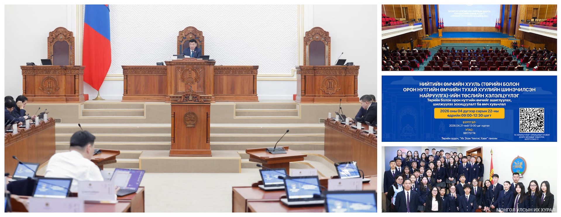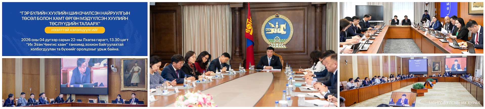 - Улсын Их Хурлын Хууль зүйн байнгын хороо, Монгол Улсын Их Хурлын даргын 2026 оны 27 дугаар захирамжаар байгуулагдсан Ажлын хэсгээс “Гэр бүлийн хуулийн шинэчилсэн найруулгын төсөл болон хамт өргөн мэдүүлсэн хуулийн төслүүдийн талаарх” хэлэлцүүлгийн бүртгэл 2026 оны 04 дүгээр сарын 21-ний өдрийн 17.30 цаг хүртэл үргэлжилнэ (дэлгэрэнгүй)