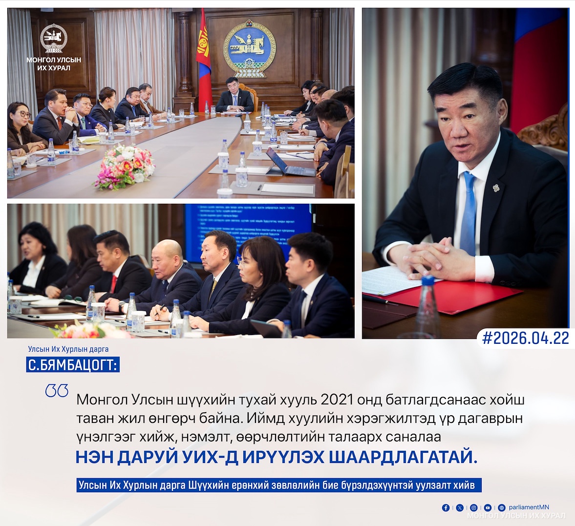 Монгол Улсын Их Хурлын дарга С.Бямбацогт өнөөдөр (2026.04.22) Шүүхийн ерөнхий зөвлөлийн дарга, гишүүдтэй уулзаж, тус зөвлөлийн үйл ажиллагаа, хууль эрх зүйн орчин, тулгамдаж буй асуудлуудын талаар мэдээлэл сонсож, санал солилцлоо. (дэлгэрэнгүй)